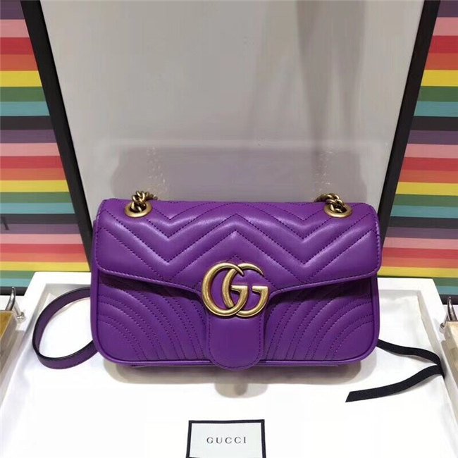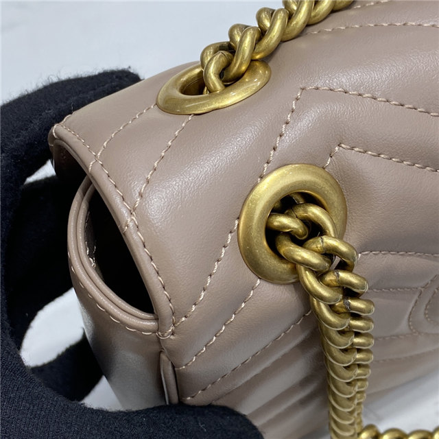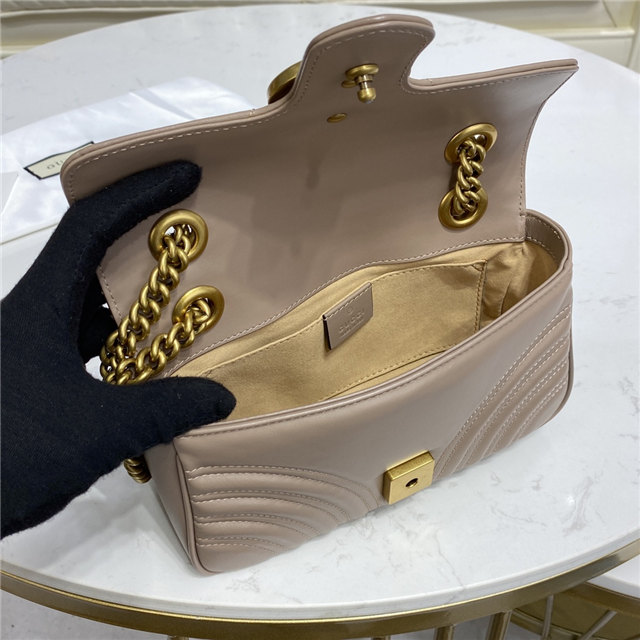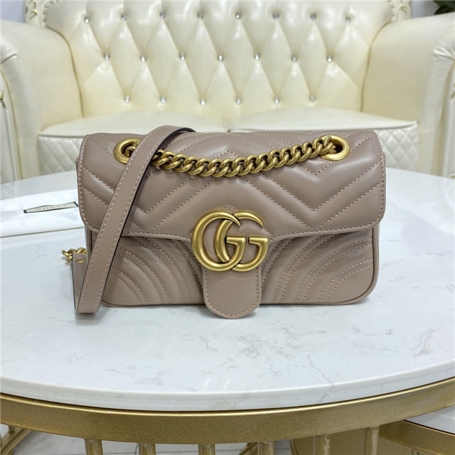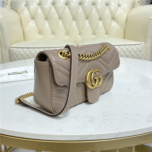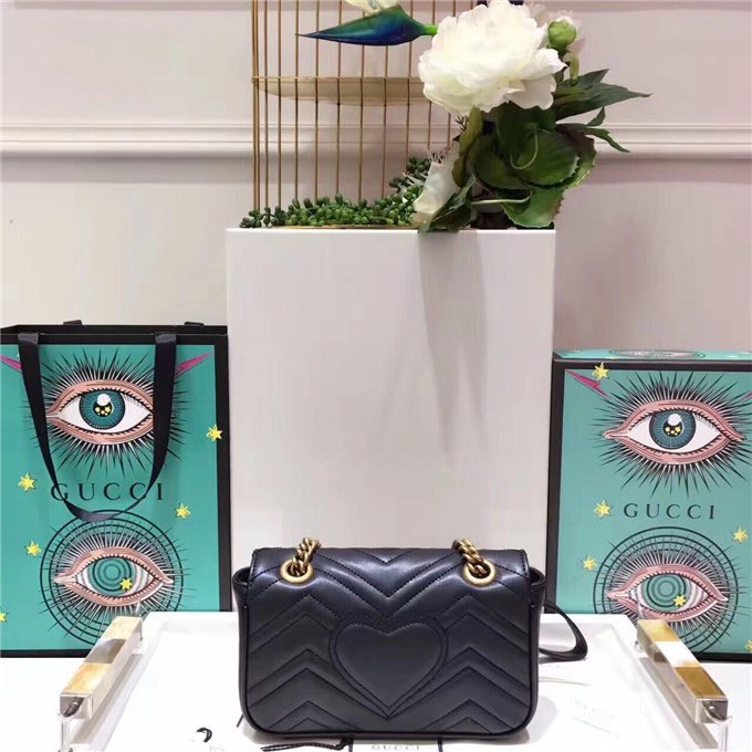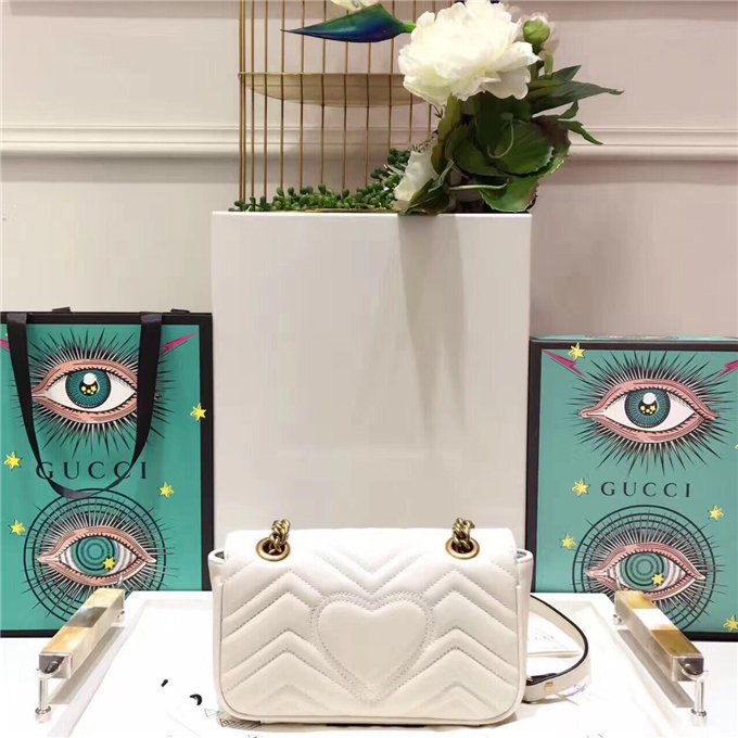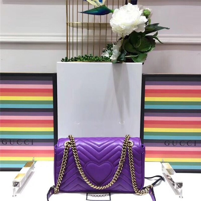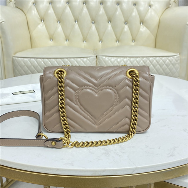 The small GG Marmont chain shoulder bag has a softly structured shape and an oversized flap closure with Double G hardware. The sliding chain strap can be worn multiple ways, changing between a shoulder and a top handle bag. Made in matelasse chevron leather with a heart on the back.