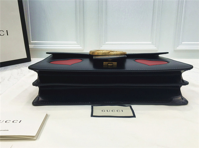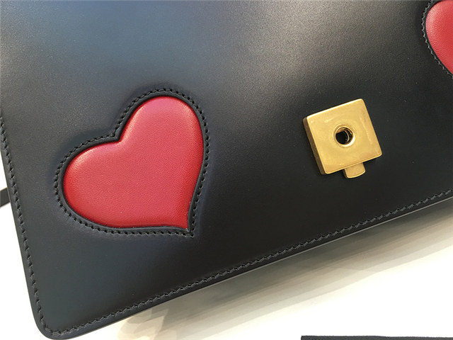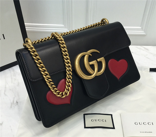 Gucci shiny leather shoulder bag with embedded red hearts.