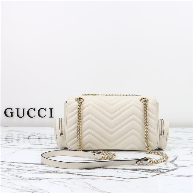 The GG Marmont line has always combined innovative material and design, and for Pre-Fall, multiple zip pockets placed on the outside further emphasize the geometry and sophistication of the matelassé chevron leather. Brown leather lining, light gold toned hardware, and an adjustable leather and chain shoulder strap completes this small shoulder bag.