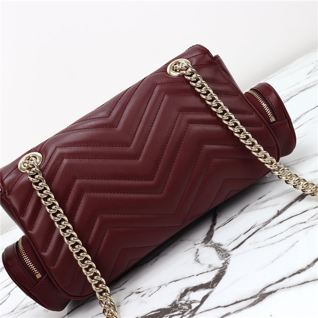 The GG Marmont line has always combined innovative material and design, and for Pre-Fall, multiple zip pockets placed on the outside further emphasize the geometry and sophistication of the matelassé chevron leather. Ivory leather lining, light gold toned hardware, and an adjustable leather and chain shoulder strap completes this small shoulder bag in the Gucci Rosso Ancora hue.
