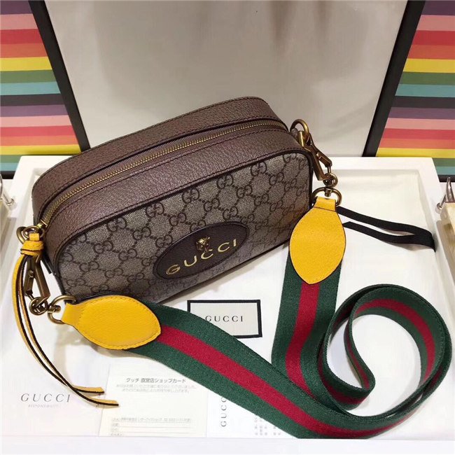 A collection of vintage inspired bags speaks to the contemporary voyager, trimmed with the House Web stripe. Made in GG Supreme canvas with yellow leather details. The contrast trims pay homage to the House’s past, when artisans would repair luggage by replacing worn areas with new ones in any colors that were available.
