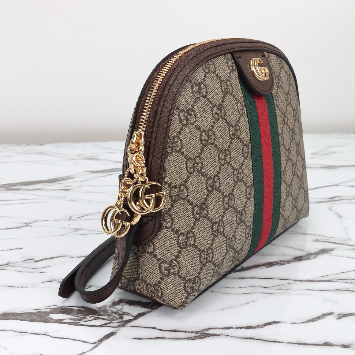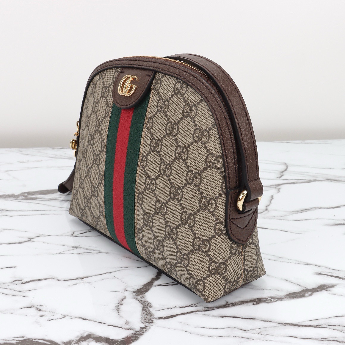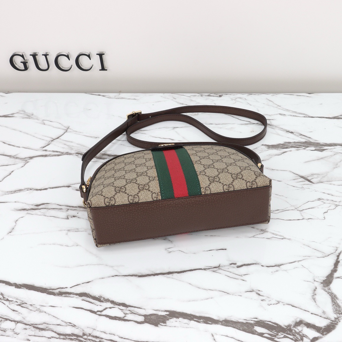 Crafted in GG Supreme with inlaid Web stripe detail, the shoulder bag has a domed shape that recalls vintage designs. The Double G, an archival code, appears on a leather tab detail and on the zipper pull.