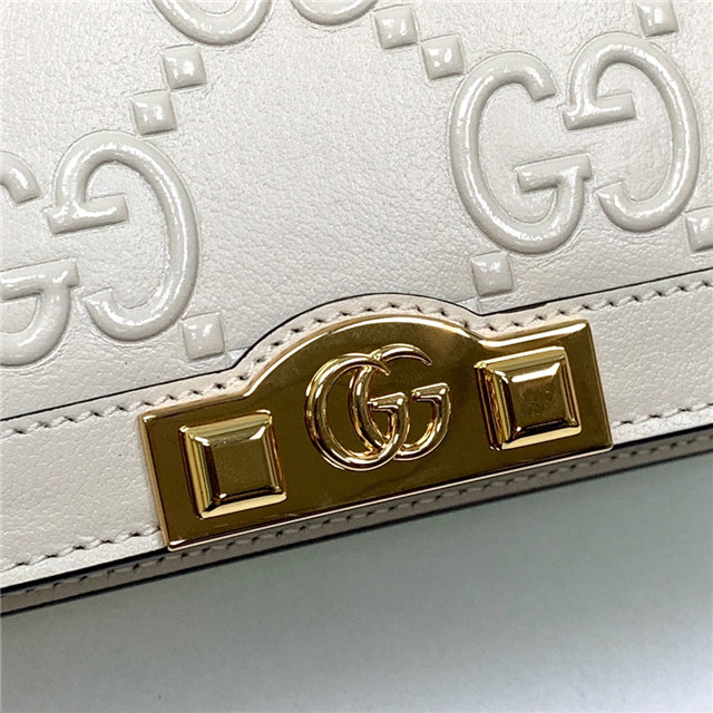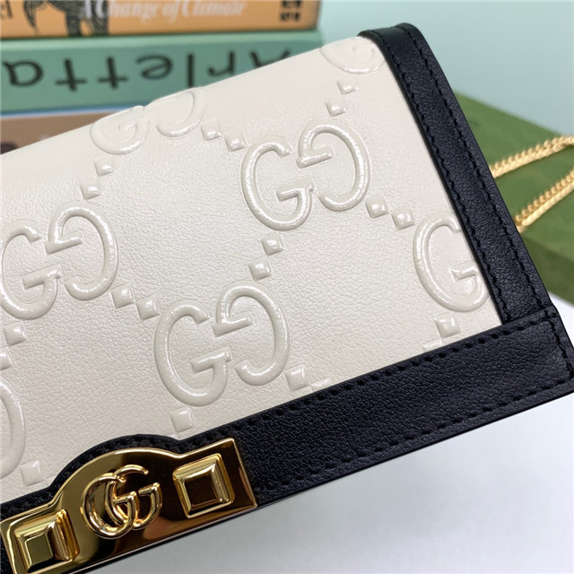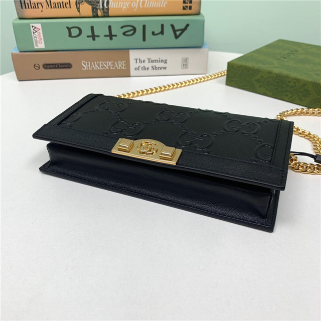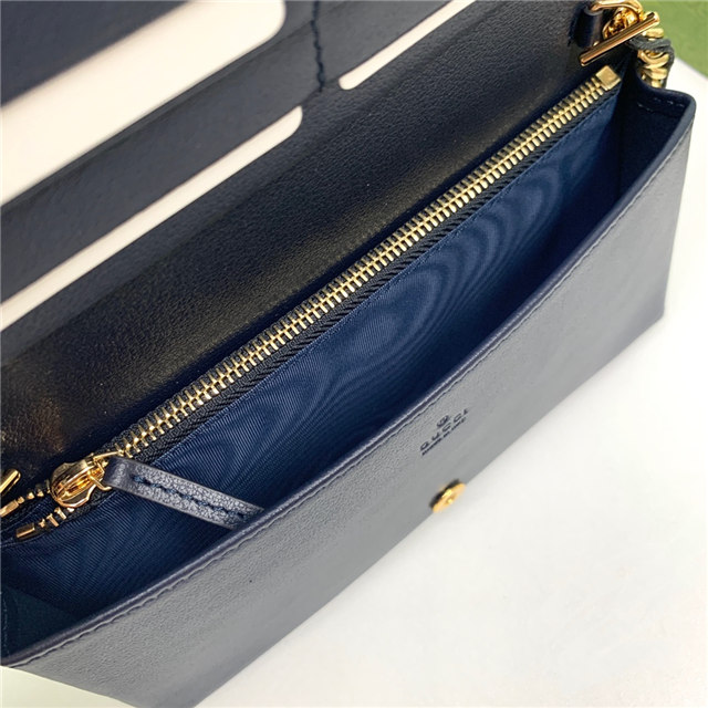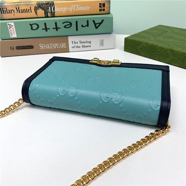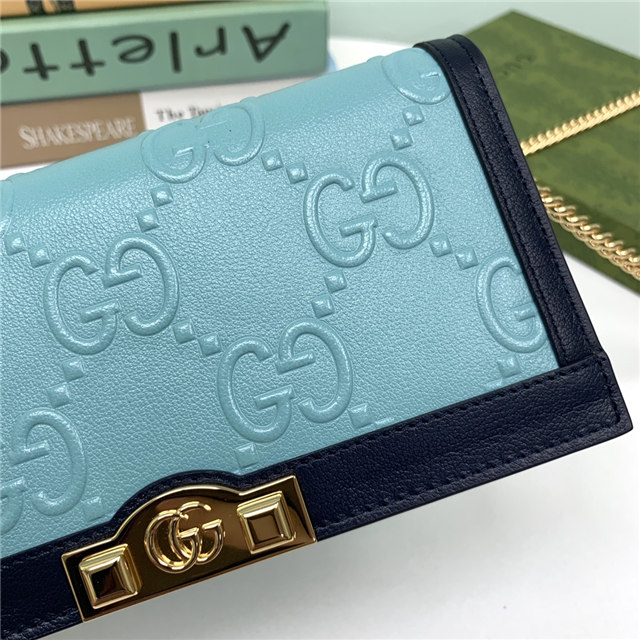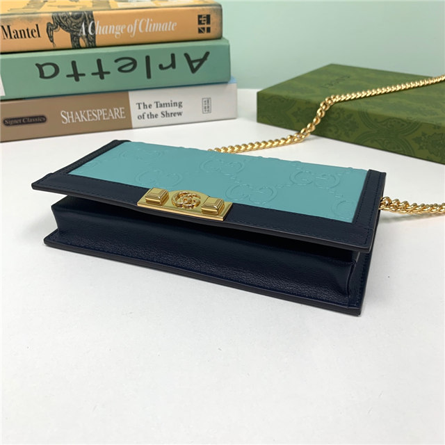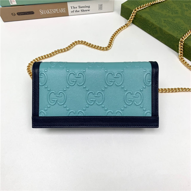 Contemporary House codes from the last six years are paired with modern design details. Here, the emblematic GG motif is paired with studs, adding a contemporary twist to this vintage-inspired style. The embossed motif defines this light blue leather chain wallet.