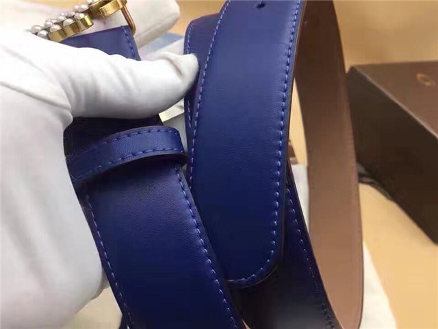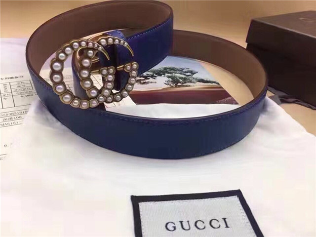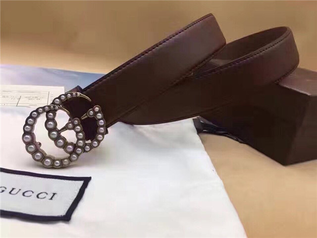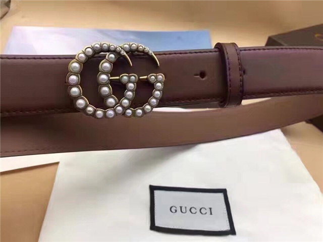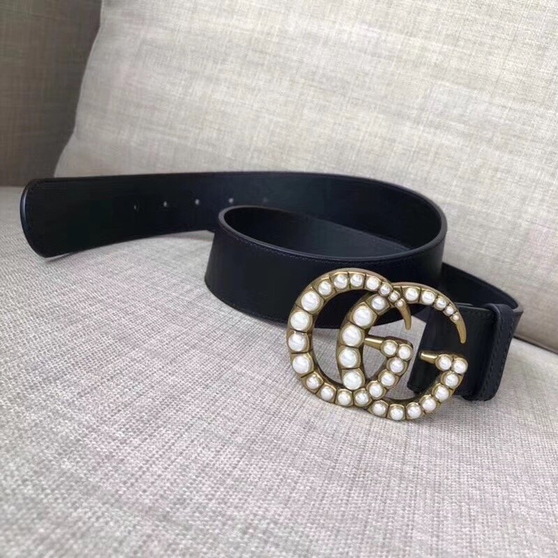 The Gucci Double G is enriched with pearl effect studs and scalloped trims. Placed on a smooth leather belt.