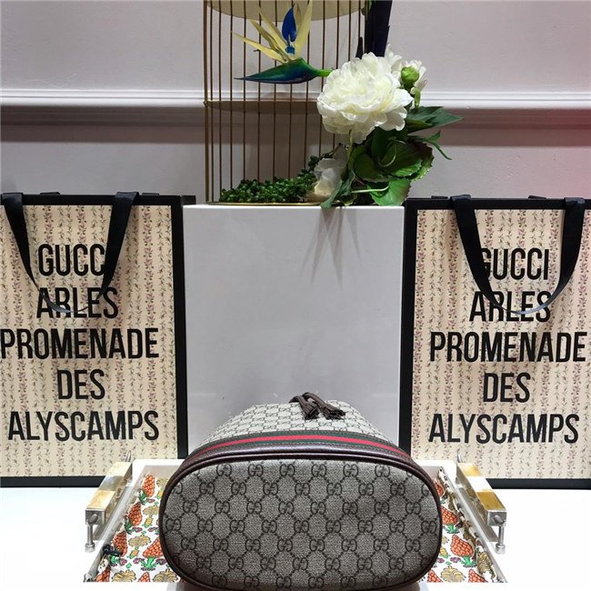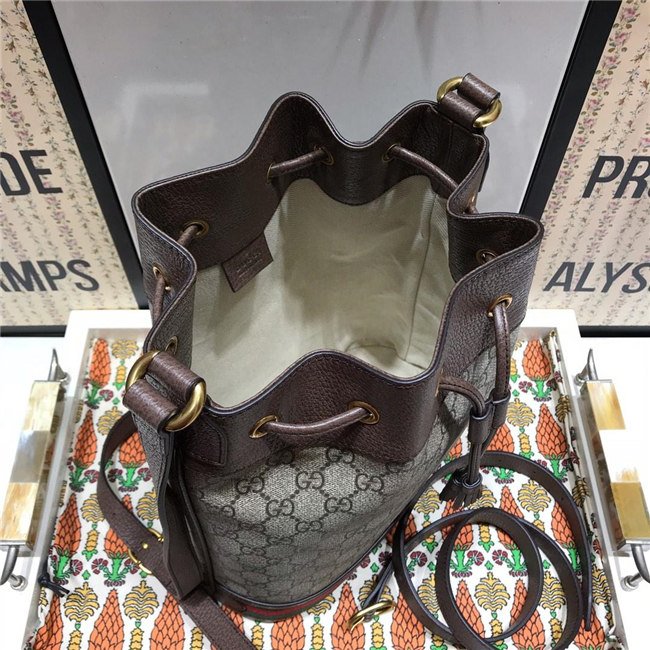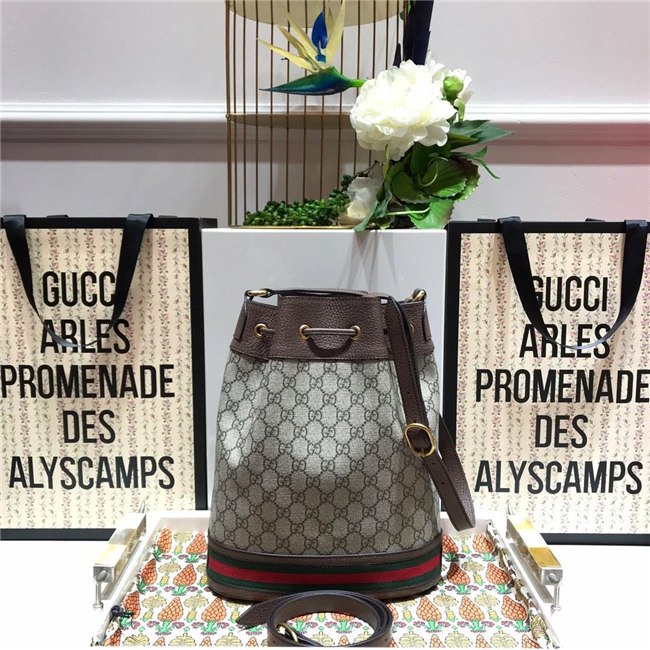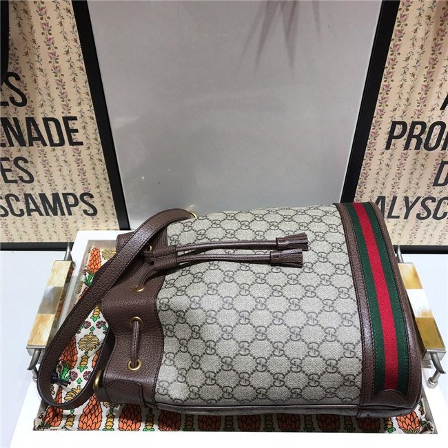 A drawstring shoulder bag with a bucket shape made in soft GG Supreme makes for a multi-functional addition in the world of Ophidia. Trimmed in brown leather, the accessory is defined by the green and red Web stripe inlaid at the bottom. Completed with an extra strap, that can be attached to the original one to emphasize the length, this bag can also be worn across the body.