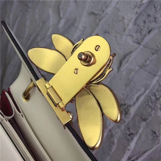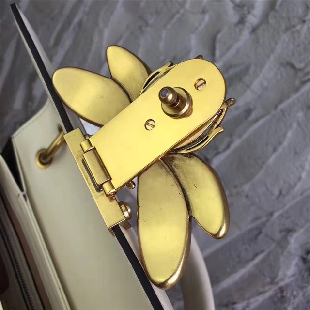 The Queen Margaret line mixes iconic Gucci details with newly established codes. The bee-a historical Gucci code taken from the 70s archives-is enriched by glass pearls and multicolor crystals. An ID holder with gold embossed “Blind for Love”, a reference to inclusive romanticism, hangs over the top handle. Made in smooth leather with a slight shine in a color block design.