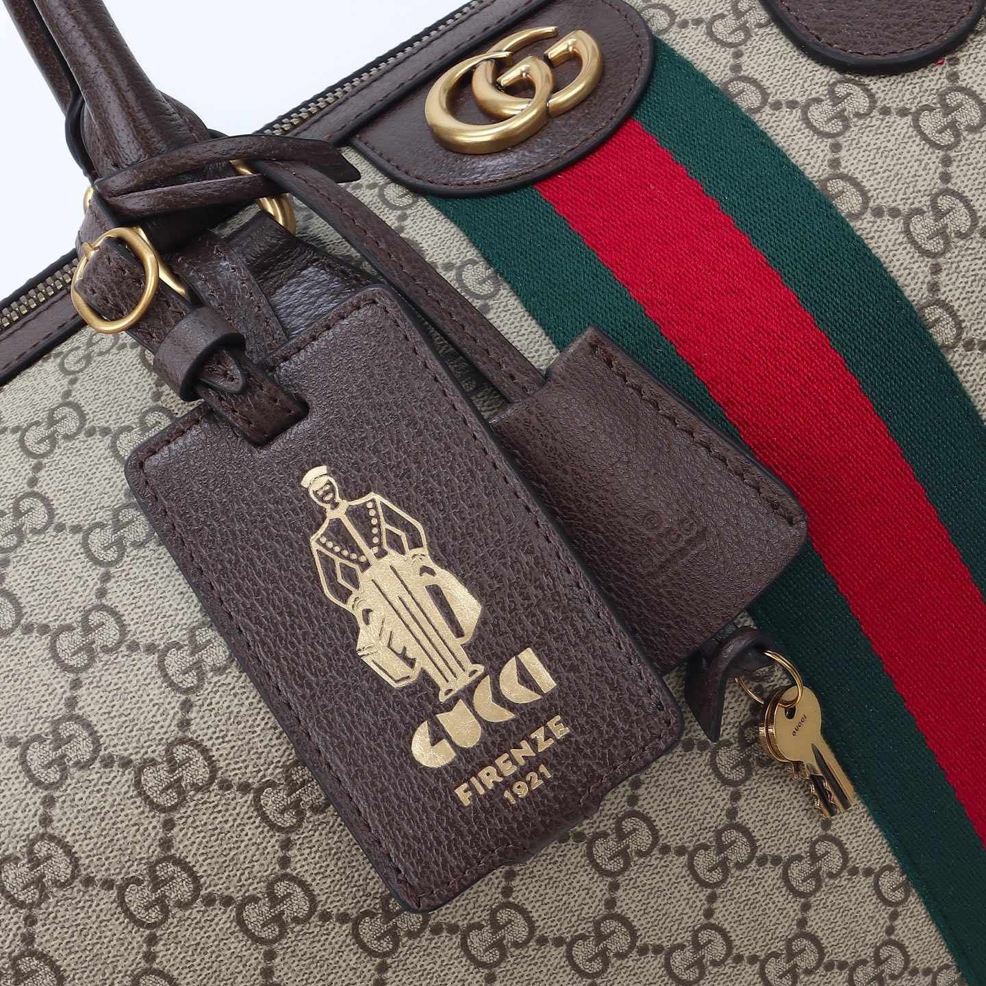 Gucci Savoy in the beige and dark brown palette offers signature silhouettes, crafted with a soft touch. This duffle bag is presented in GG Monogram coated fabric and enriched with a Double G and Web detail.