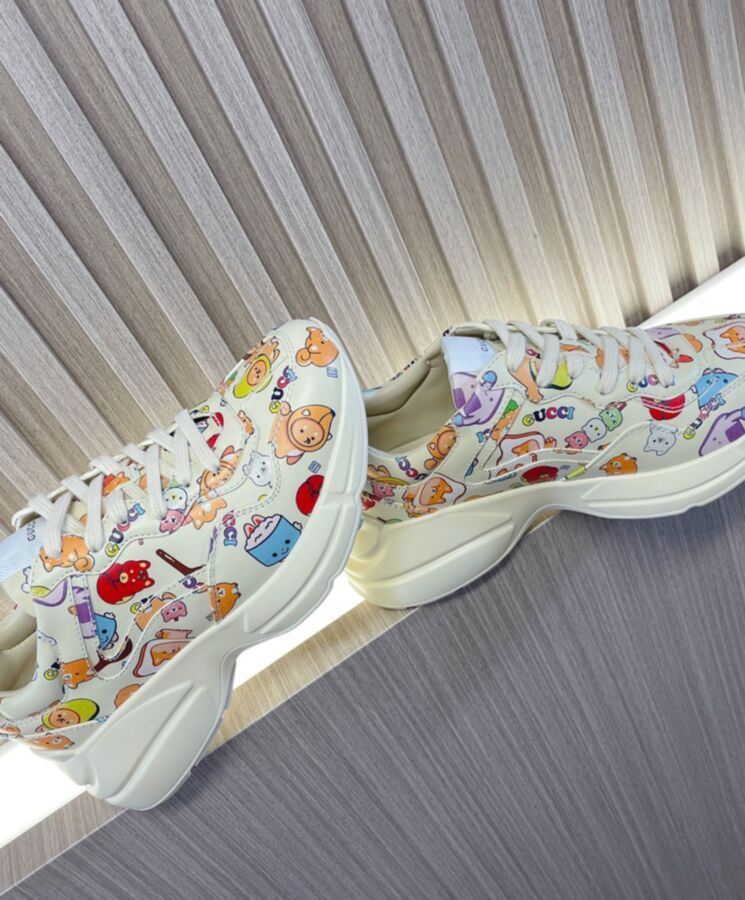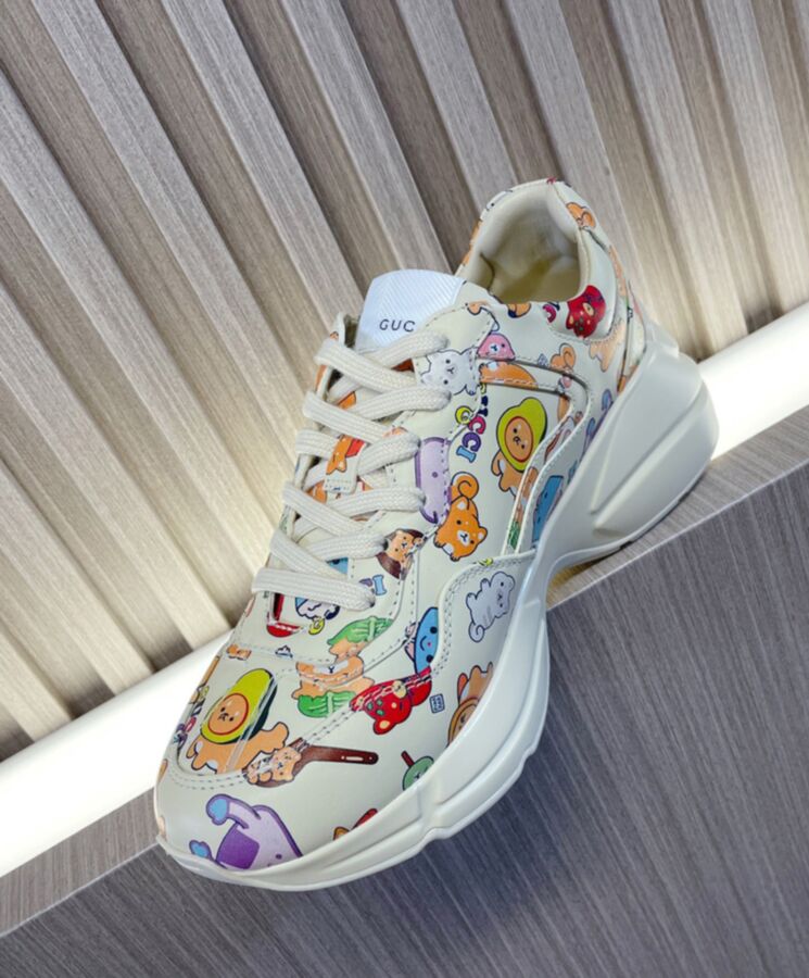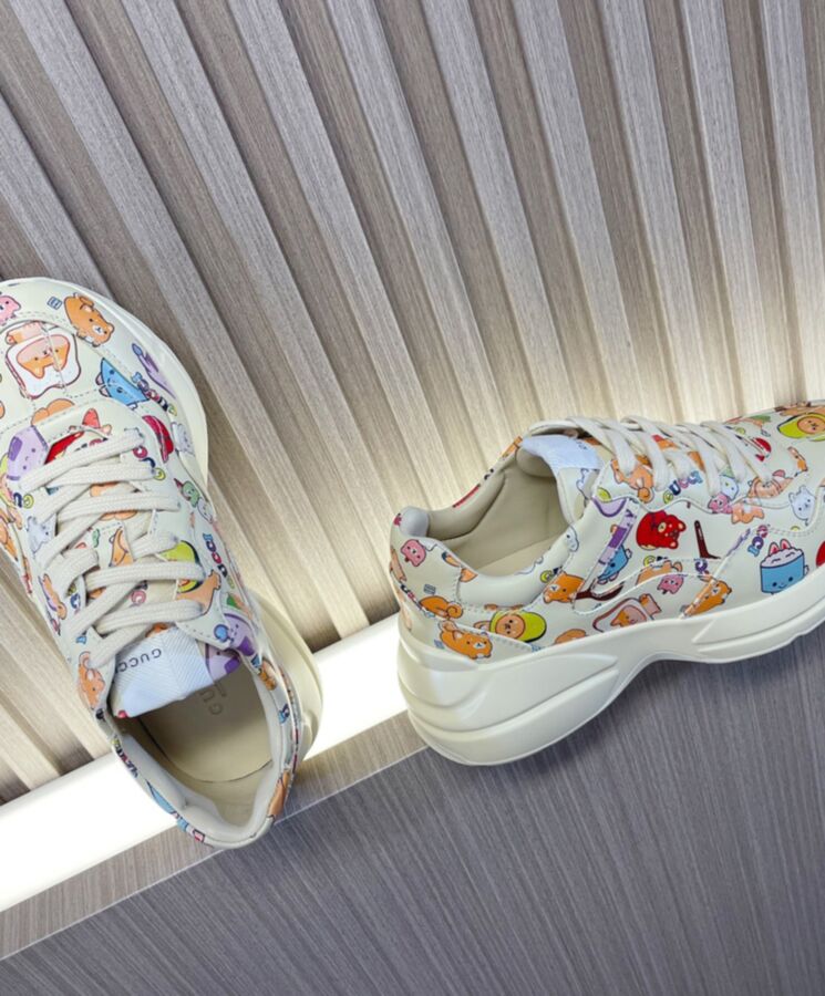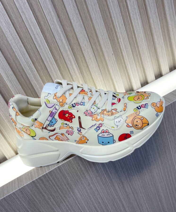 The artwork by America-based illustrator and designer, Angela Nguyen, also known as Pikarar, adds a playful touch to ready-to-wear pieces and accessories with vibrant prints or embroideries inspired by pop culture, anime, and animals. Here this Rhyton sneaker is defined by a Gucci animal print.