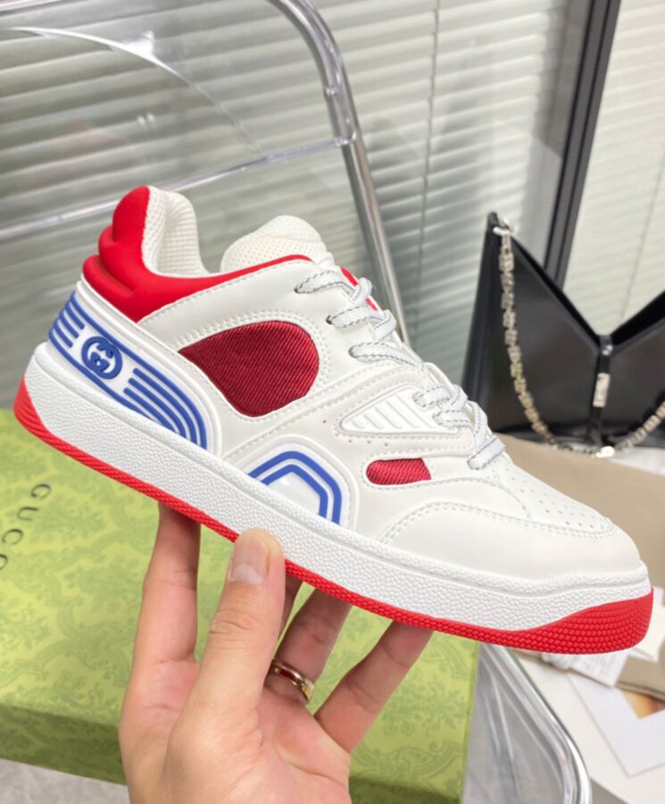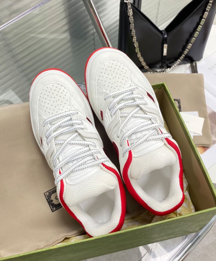 Sporting a look synonymous with basketball sneakers from the 90s, the House introduces the newest rendition of the lace-up sneaker Gucci Basket. This style emulates the self-expression of on-court aesthetic with distinctive features and detailing. Presented in white and finished with a lightly distressed effect, each pair is crafted primarily from Demetra. Created with the same processes used for tanning, the new material offers pliable and resilient performance with a supple finish. The eco-friendly material combines animal-free raw materials primarily from sustainable, renewable, and bio-based sources.