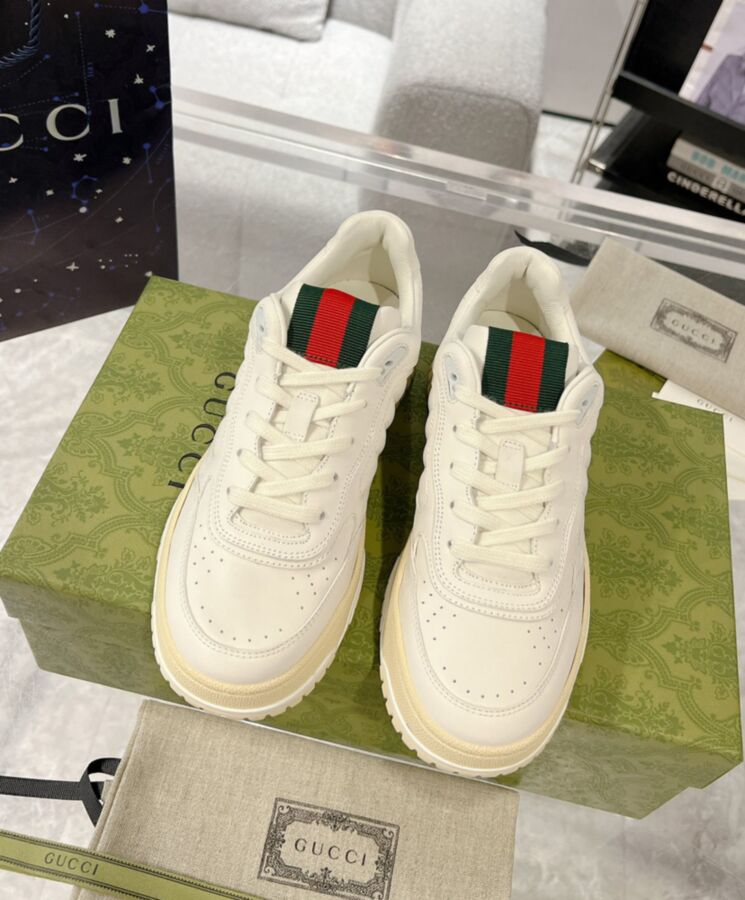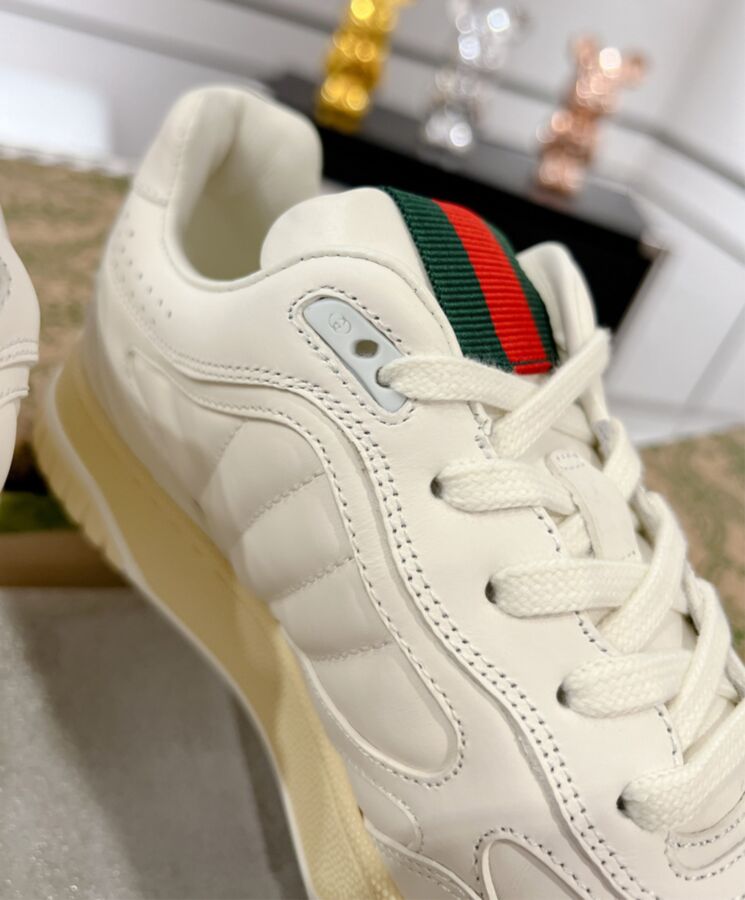 The first trainers envisioned by Sabato De Sarno for the House, the Re-Web sees Gucci’s heritage stripes as a bold statement detail on a contemporary silhouette. This pair is crafted from leather. Defined by multiple iconic details, this new trainer takes centre stage with the bold green and red Web tongue.