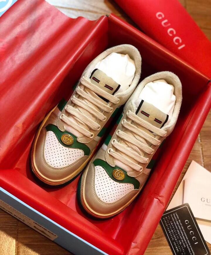 The Spring Summer 2019 collection continues to reference old school shapes and materials inspired by vintage sportswear. Influenced by classic trainers from the ’70s and named for the defensive sports move, these sneakers feature the Web stripe on the side and vintage Gucci logo, treated for an allover distressed effect. It has an unexpected layer with the removable cherries with crystals that further pushes the notion of bringing contrasting elements together in new ways.