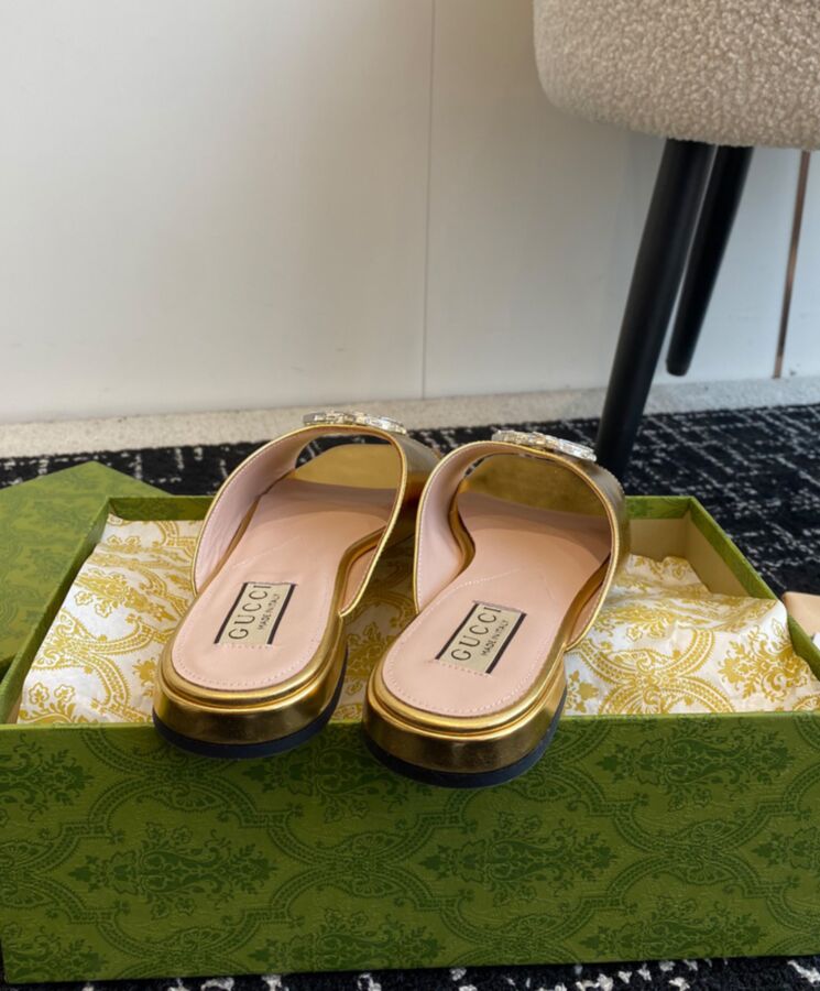 A crystal-set Double G elevates a selection of feminine footwear. The sparkling hardware adorns this pair of slide sandals. Crafted from leather, the accessory is completed by a leather sole. Double G with crystals Leather sole Flat