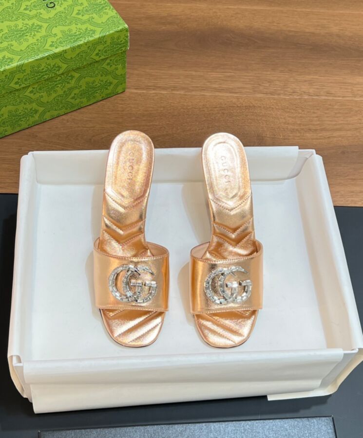 The line presents a range of signature styles designed in celebration of beautiful night skies, with metallics, sparkling details and delicate colour palettes. Here a copper coloured leather defines this slide sandal with a crystal Double G.