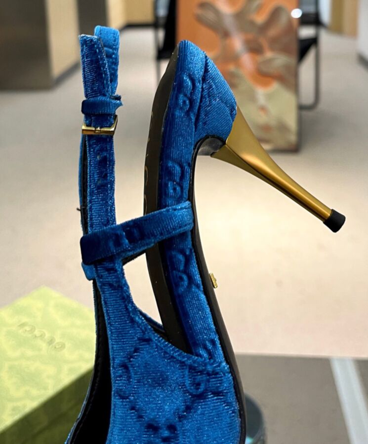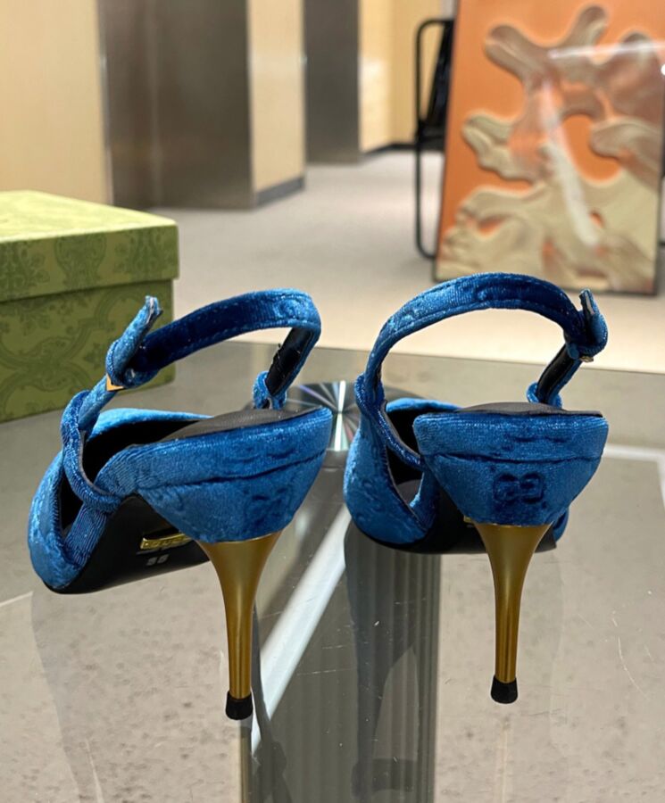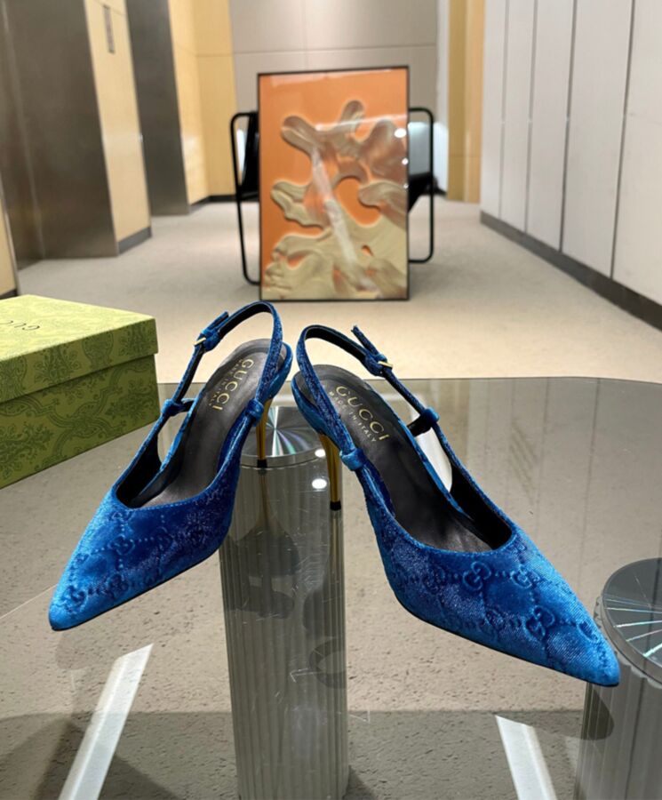 This feminine pair of slingback pumps features a pointed toe. Crafted from a distinctive GG velvet, the elegant design is completed by a high metal heel. GG velvet Leather sole Pointed toe Metal heel detail High heel 105mm heel height