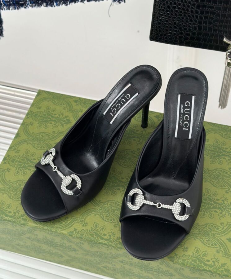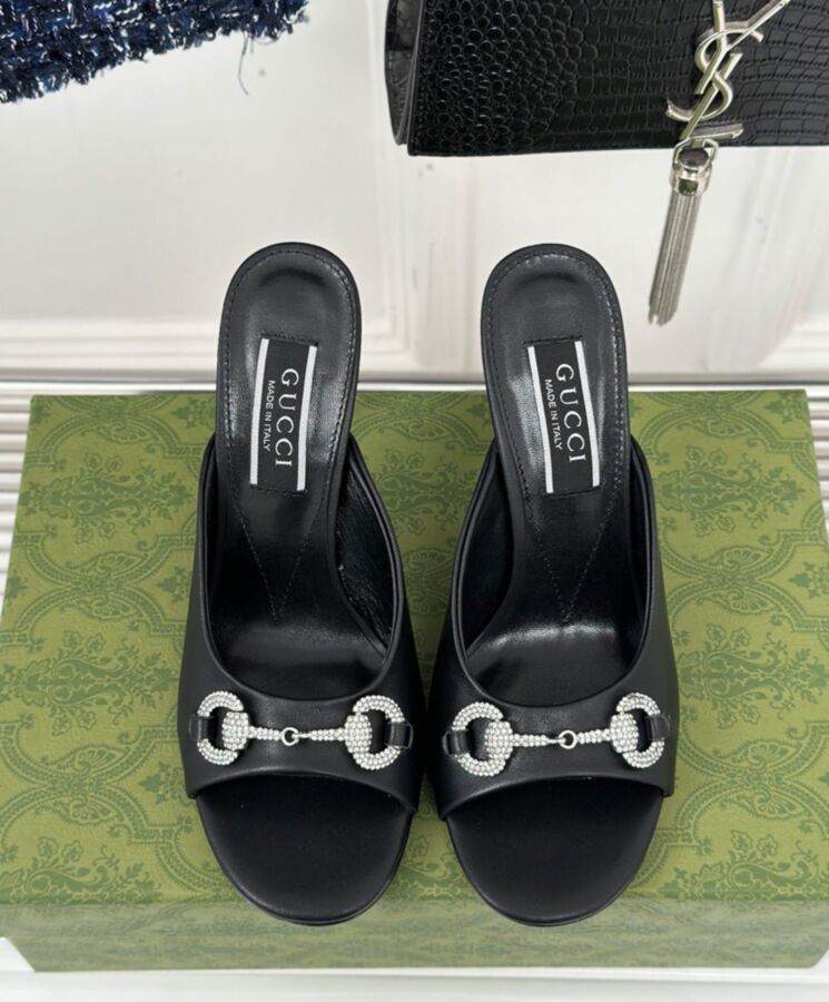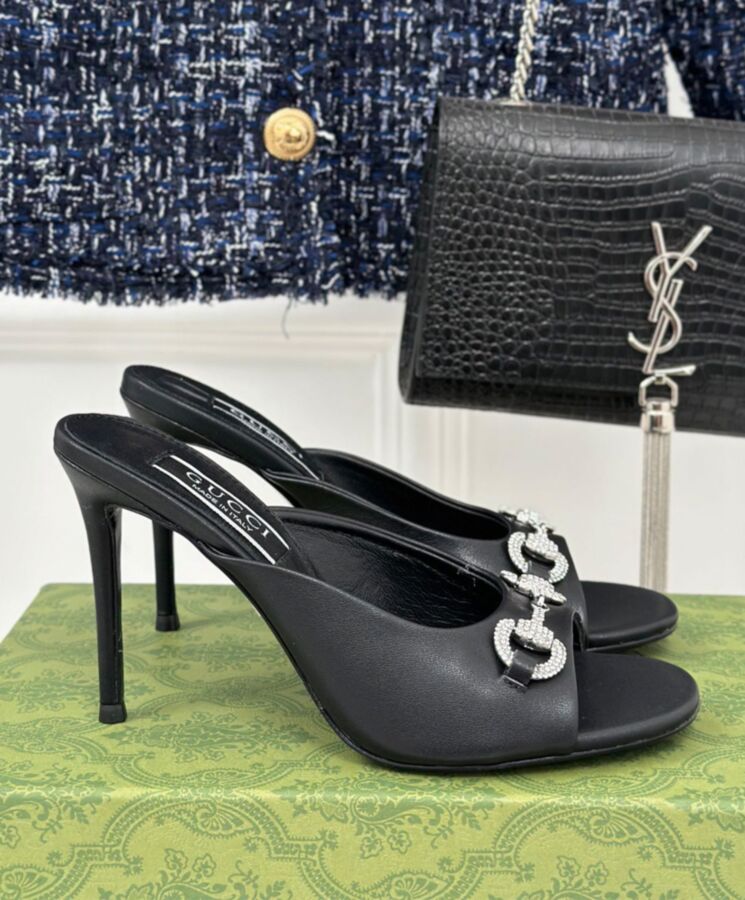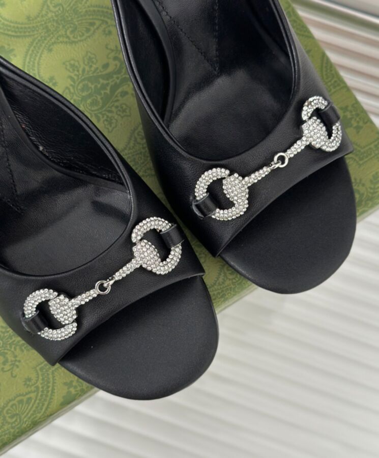 Guccio Gucci continues to make an appearance throughout every collection through immediately recognisable logo details. Here, this pair of leather slide sandals is defined by the Horsebit hardware with crystals.