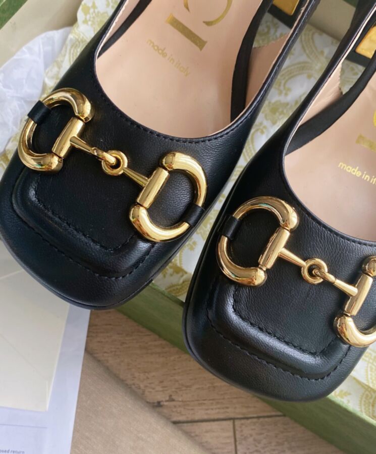 A slingback pump with vintage accents such as a square shaped toe and sculpted block heel. A code from the archives, the Horsebit detail connects the style to the House’s equestrian roots. The style is presented in leather.