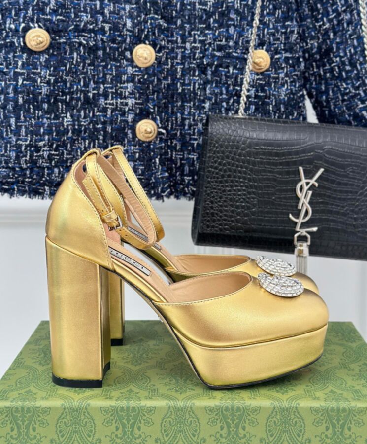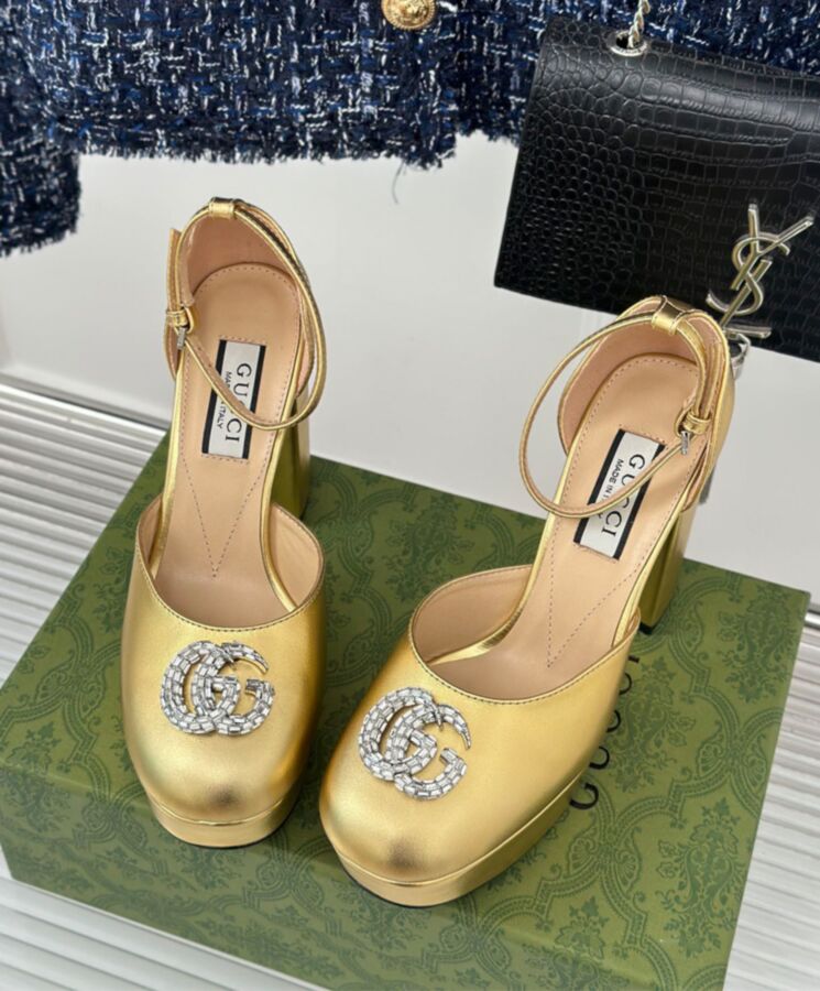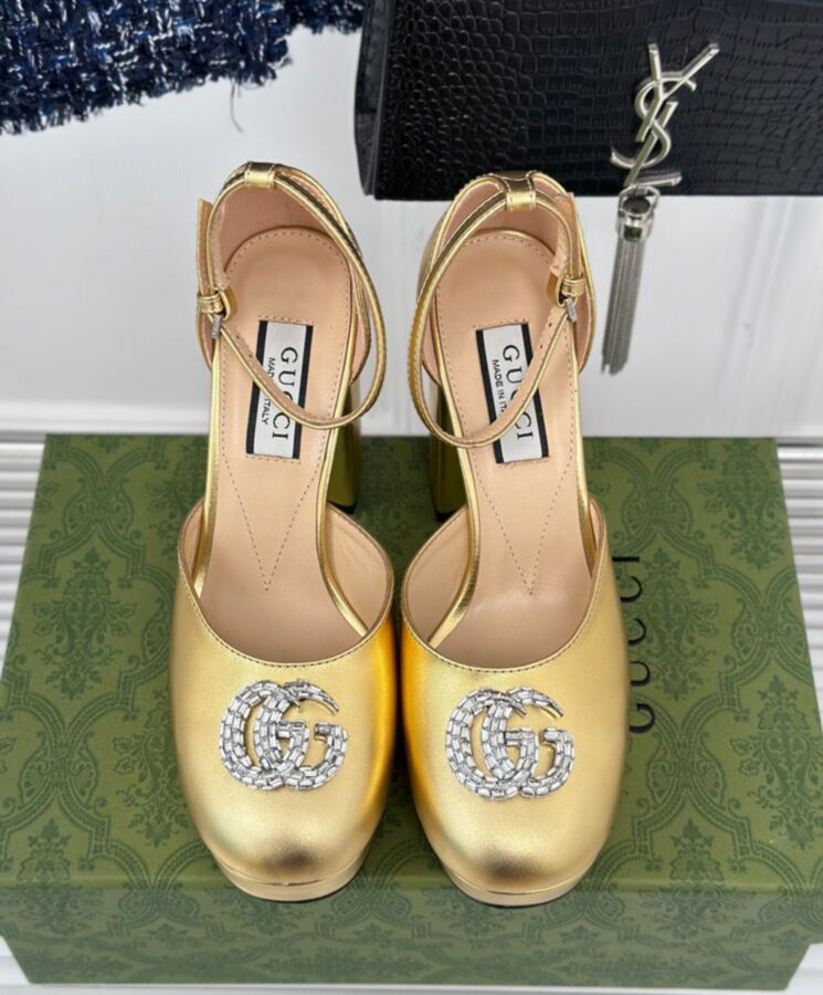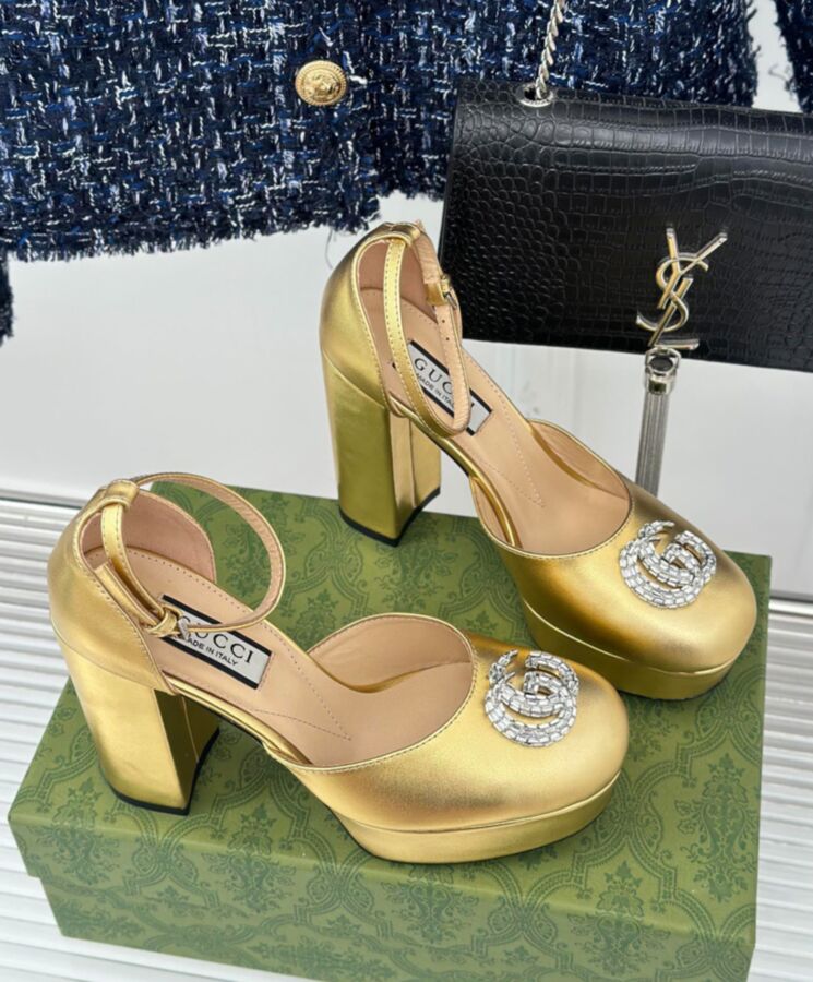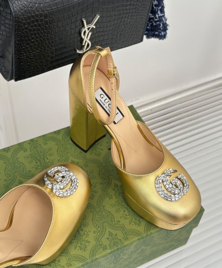 A crystal-set Double G elevates a selection of feminine footwear. The sparkling hardware adorns a variety of designs, from slides to platform pumps, complemented by colored patent or metallic leather. This design appears in with the crystal Double G standing out across the upper and complete with an adjustable ankle strap.