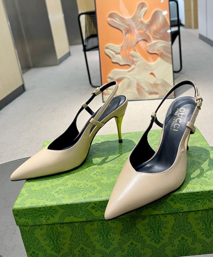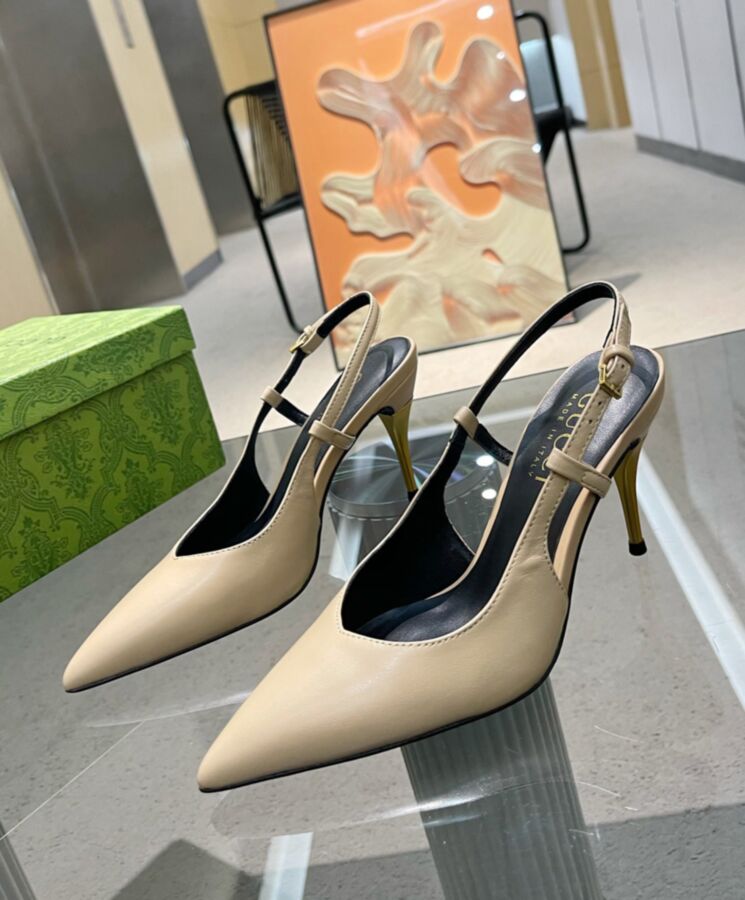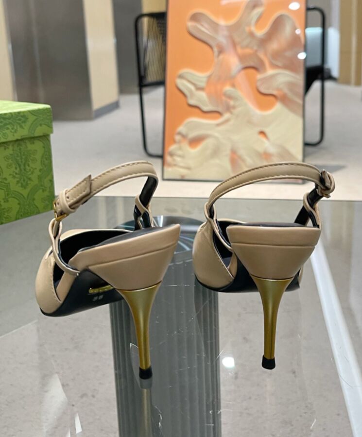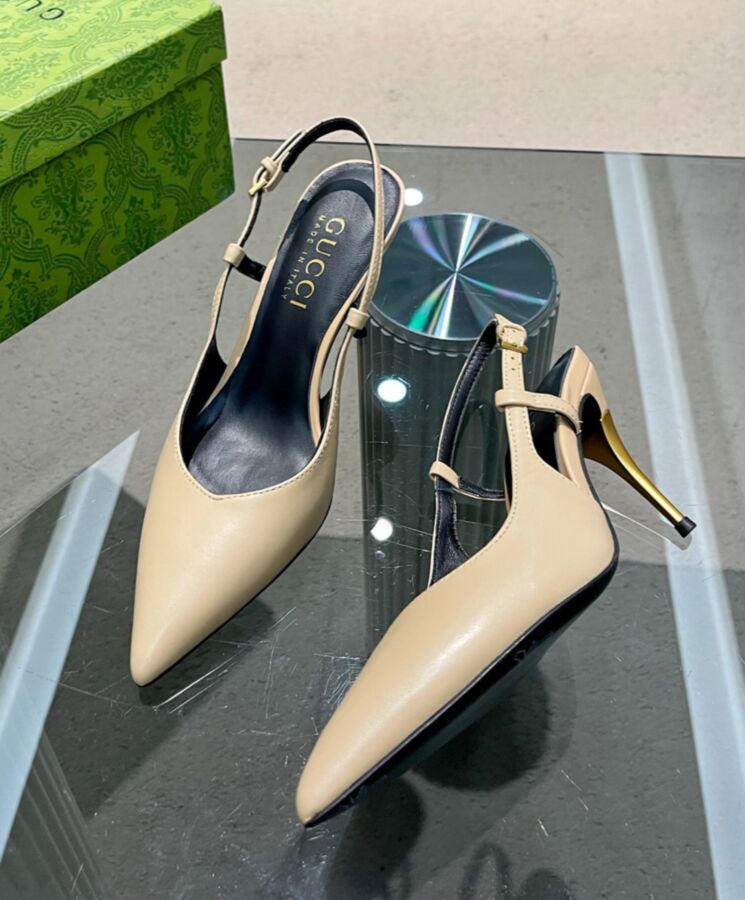 This beloved pump silhouette returns with sling-back and mule variations crafted in different materials. From leather to satin and velvet, the silhouette transitions from day to evening. This pointed-toe style appears in leather with a metal effect heel.