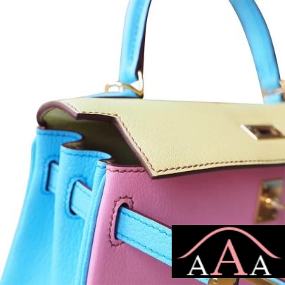 Hermes Kelly 25 Handbag 1Q Rose Confetti And 1Z Jaune Poussin And 7N Celeste Chevere Ghw