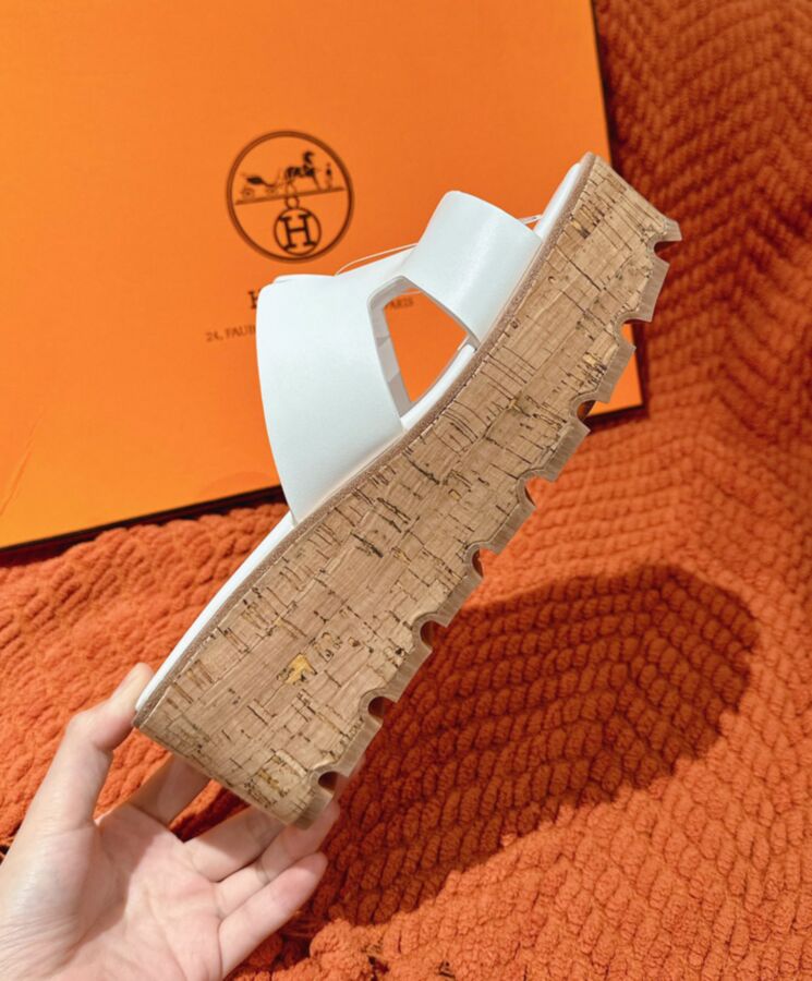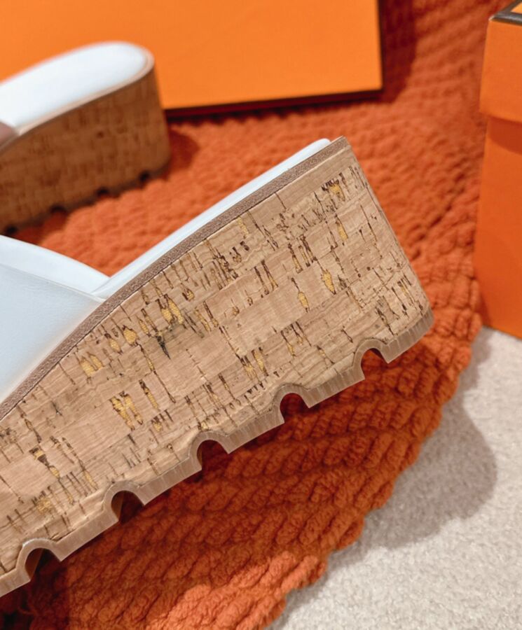 Sandal in calfskin with H cut-out. A light cork platform for a daring yet comfortable style, perfect for summer. Heel height: 2.8″ | Front sole-heel height difference: 1.2″