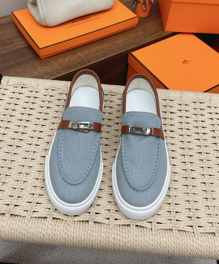 Slip-on loafer-style sneaker in denim and calfskin with functional palladium-plated Kelly buckle.