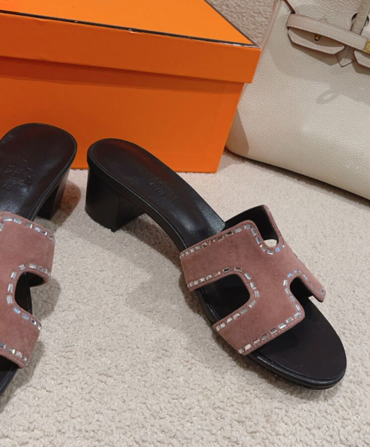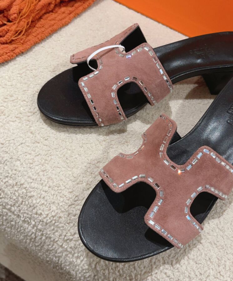 High heel sandal in suede goatskin with iconic H cut-out and rhinestone details. An iconic Hermes style, this silhouette is an essential piece in every wardrobe.