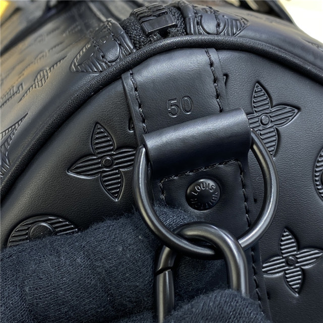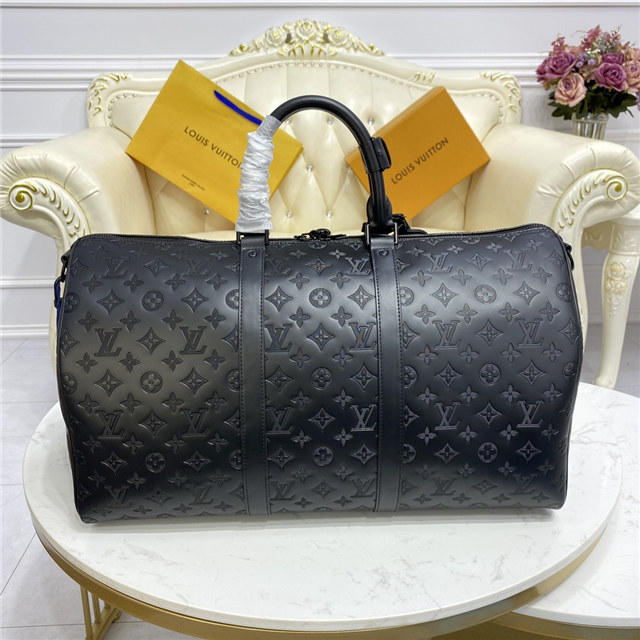 A Louis Vuitton icon, the Keepall Bandoulière 50 is revisited in Monogram Shadow leather, embossed all over with the Monogram pattern. The minimalist design is complemented by matte black hardware. Launched in the 1930s, the Keepall was the original soft travel bag, and it remains as elegant as ever, with the cabin size ideal for short trips.