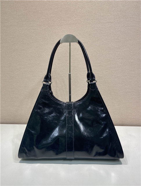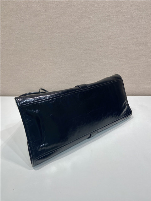 Geometric lines and refined artisan details define this bag with oversized volumes. The soft trapezoidal silhouette in leather is characterized by a delicate glossy finish with a vintage effect. The vertical clasp inspired by the archives and the leather mirror complete the accessory with a sophisticated note.