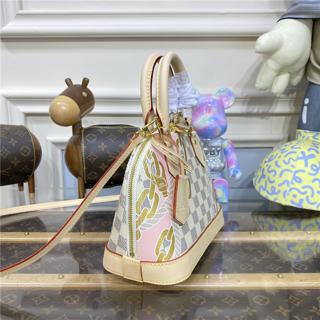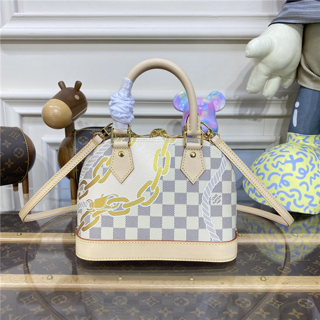 The Art-Deco lines of this Alma BB handbag are revisited in a unique version of Damier Azur canvas featuring a nautical print of ropes and chains. Ideal for a weekend at the Hamptons, the Alma is equipped with a removable and adjustable strap, in addition to top handles, for cross-body carry.