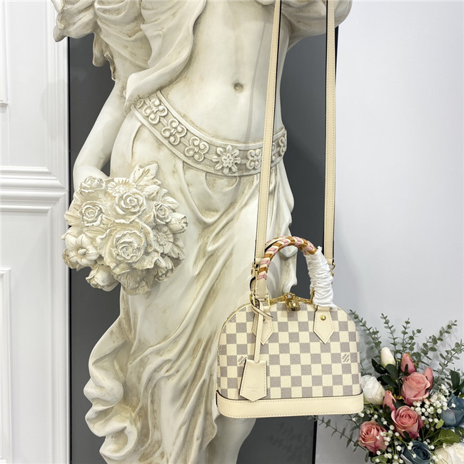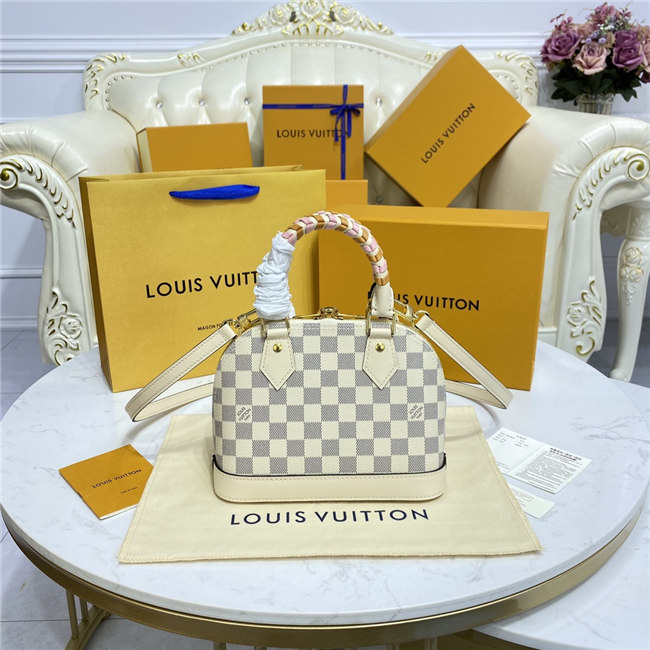 The Alma BB handbag welcomes Spring 2022 in a charming edition made from Damier Azur coated canvas, with leather trim in delicate shades of pink and cream. Two braided Toron top handles lend this model a crafted, feminine allure. The detachable long leather strap provides extra versatility, for over-the-shoulder or cross-body wear.