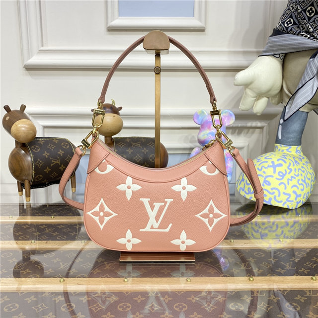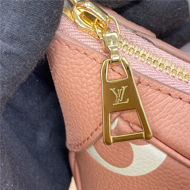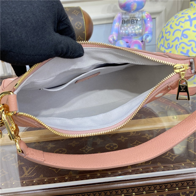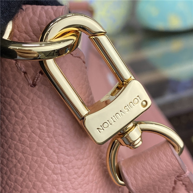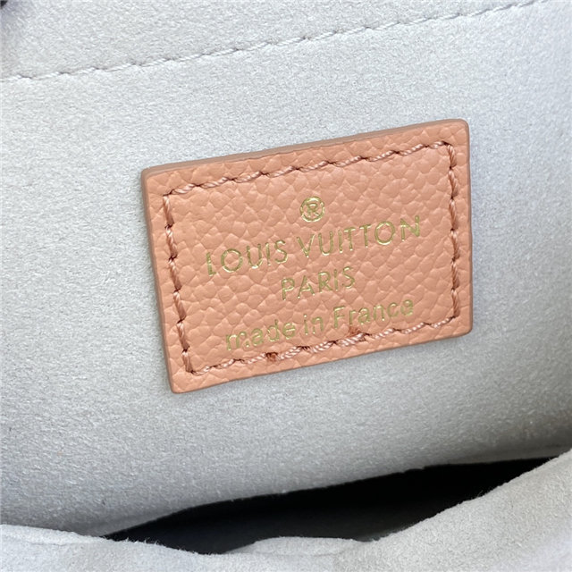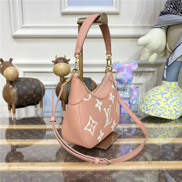 The Bagatelle mini hobo handbag is fashioned from lush grained Monogram Empreinte leather. The oversized, embossed pattern in a pink-and-cream colorway perfectly fits the bag’s curves. The Bagatelle can be carried as a baguette-hobo, worn on the elbow, or cross-body with its detachable, adjustable strap.