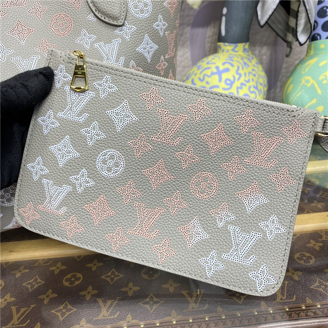 The Blossom MM tote bag is made from lightweight Mahina calfskin, with the Monogram pattern perforated into the elegant gray leather. The supple draped design makes it comfortable against the body. Inside the bag, a removable zipped pocket allows to secure belongings. Two long handles enable shoulder wear.