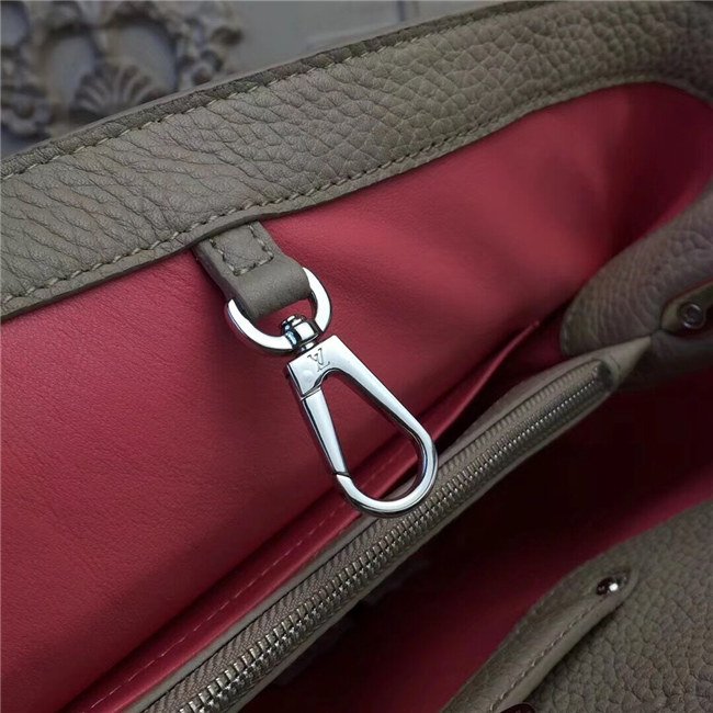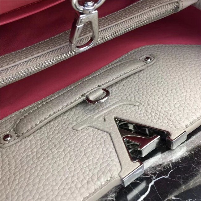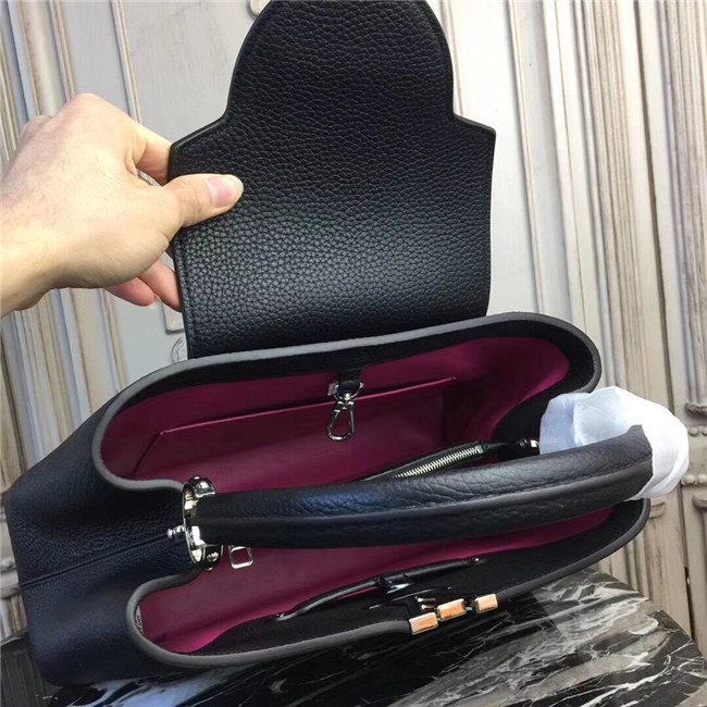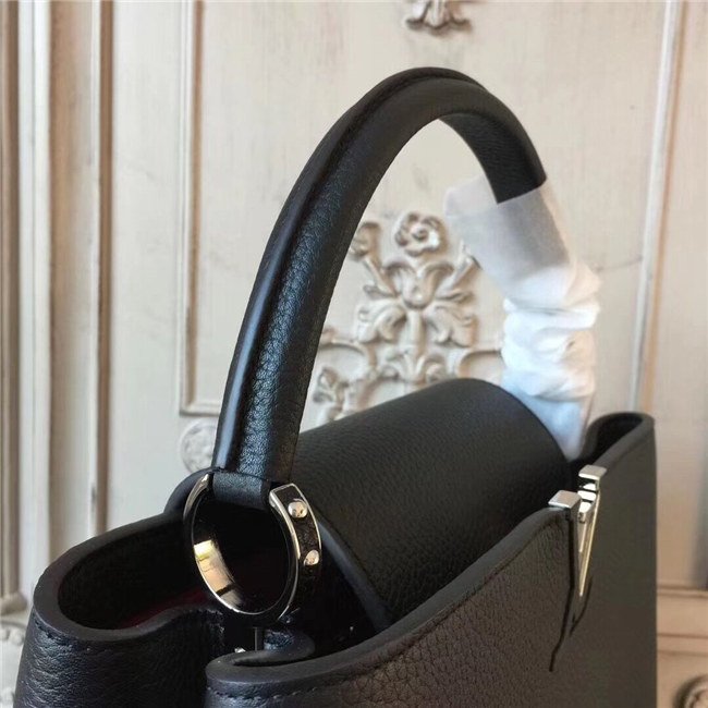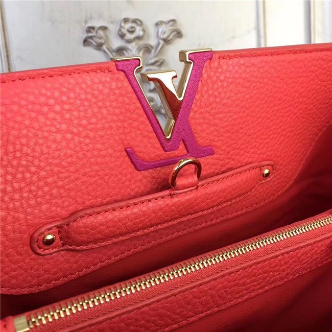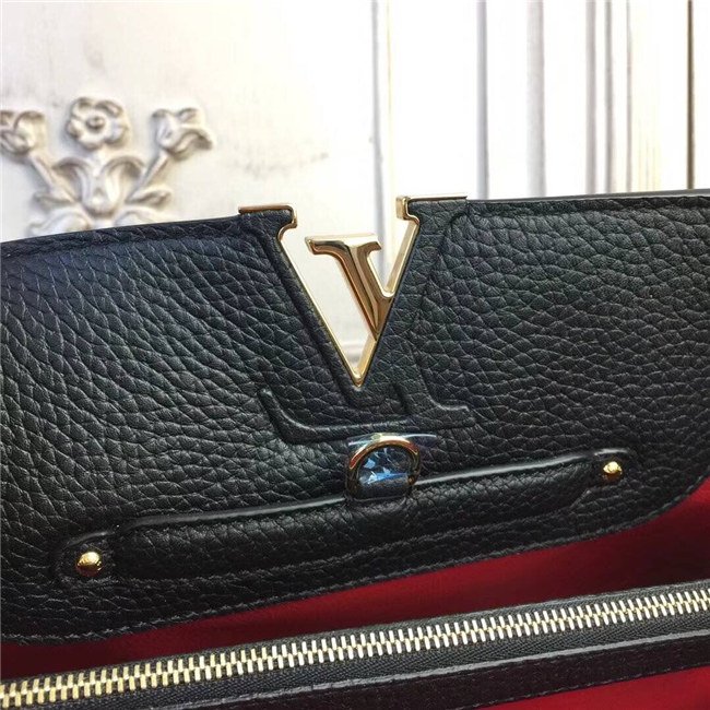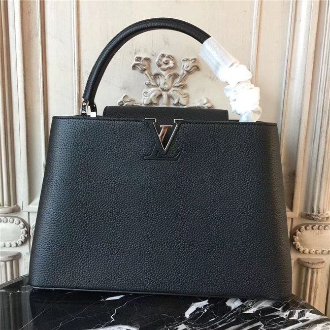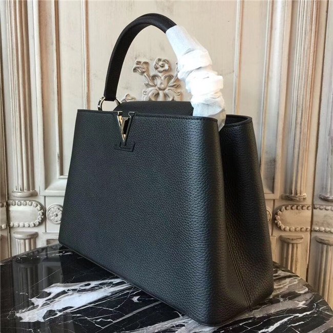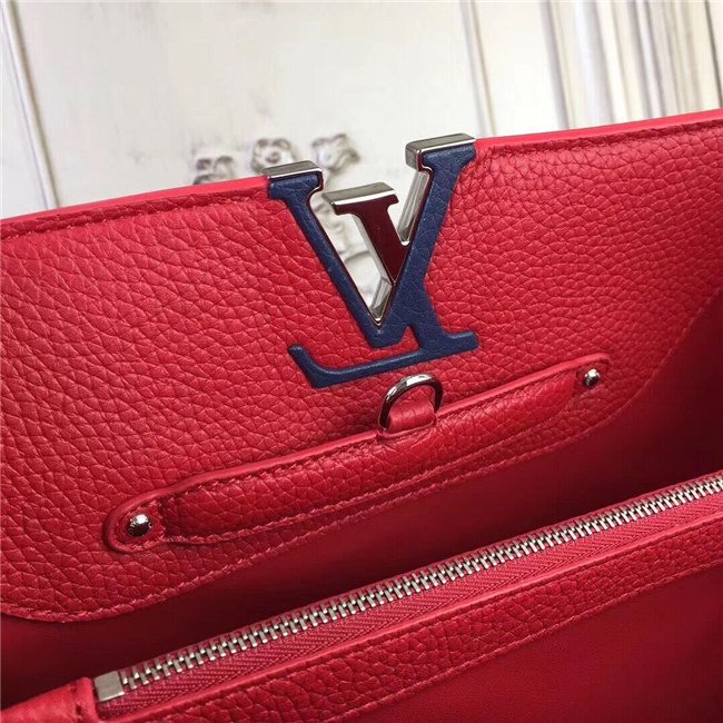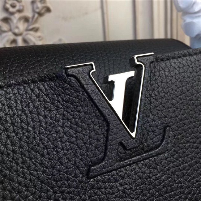 Taking its name from the Rue des Capucines in Paris, where Louis Vuitton opened his first store in 1854, the timelessly elegant Capucines bag is a testament to fine leather craftsmanship. In full-grain Taurillon leather, it combines refined details, including a semi-rigid handle secured by jewel-like rings, with a spacious and functional shape offering two inside compartments. Its distinctive flap can be worn two ways: outside to reveal the outline of a Monogram flower, or inside to show the LV initials.