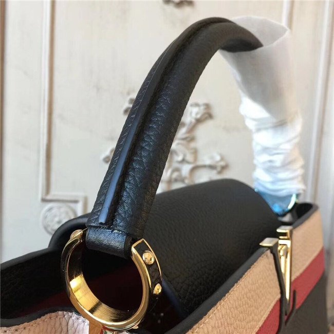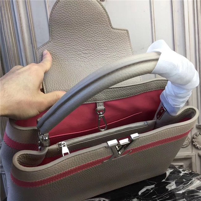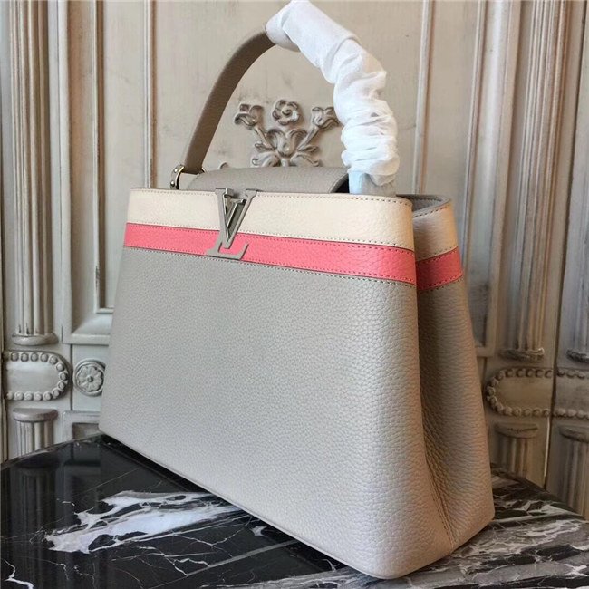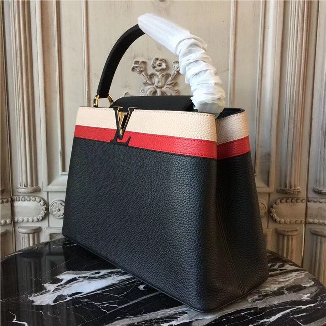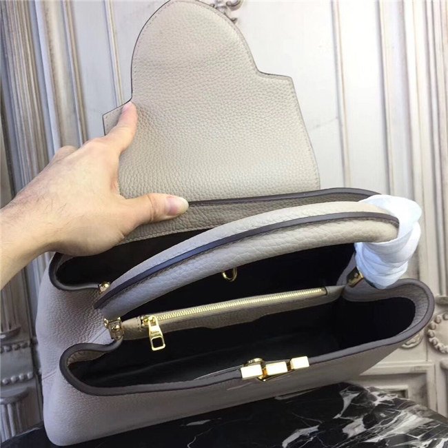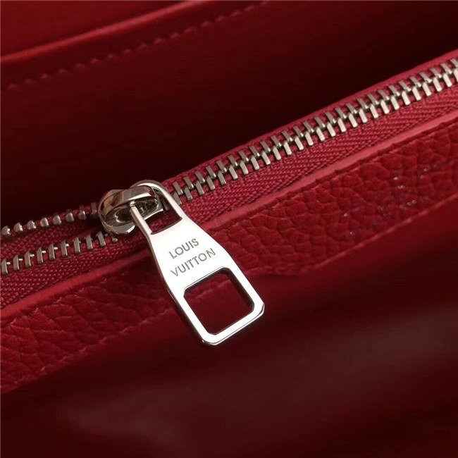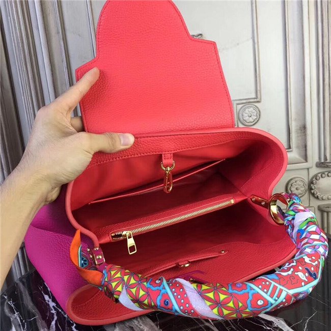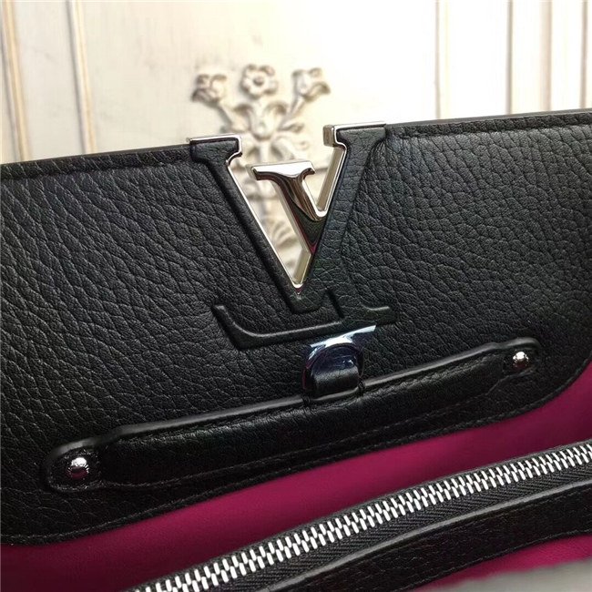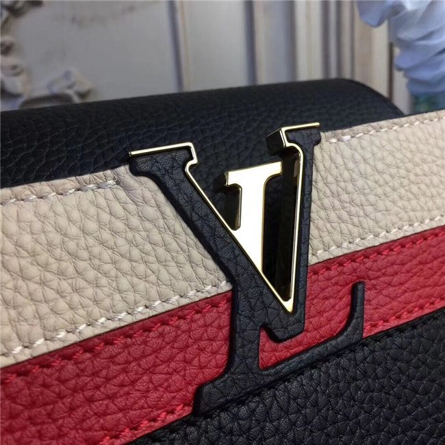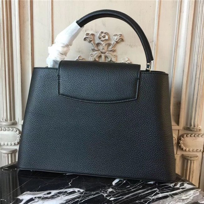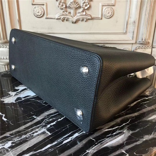 Taking its name from the Rue des Capucines in Paris, where Louis Vuitton opened his first store in 1854, the timelessly elegant Capucines bag is a testament to fine leather craftsmanship. In full-grain Taurillon leather, it combines refined details, including a semi-rigid handle secured by jewel-like rings, with a spacious and functional shape offering two inside compartments. Its distinctive flap can be worn two ways: outside to reveal the outline of a Monogram flower, or inside to show the LV initials.