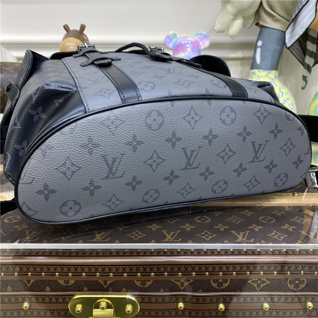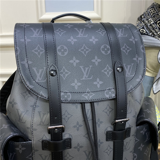 The Christopher MM backpack reinvents the rugged spirit of a hiking pack in masculine Monogram Eclipse canvas and Monogram Eclipse Reverse canvas with black leather trim. The grays and blacks are complemented by the silver highlights of the buckles and zips. Multiple pockets and a leather flap with a press-stud keep belongings safe.