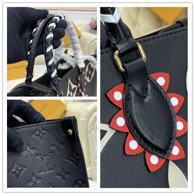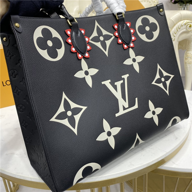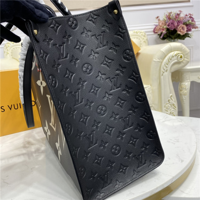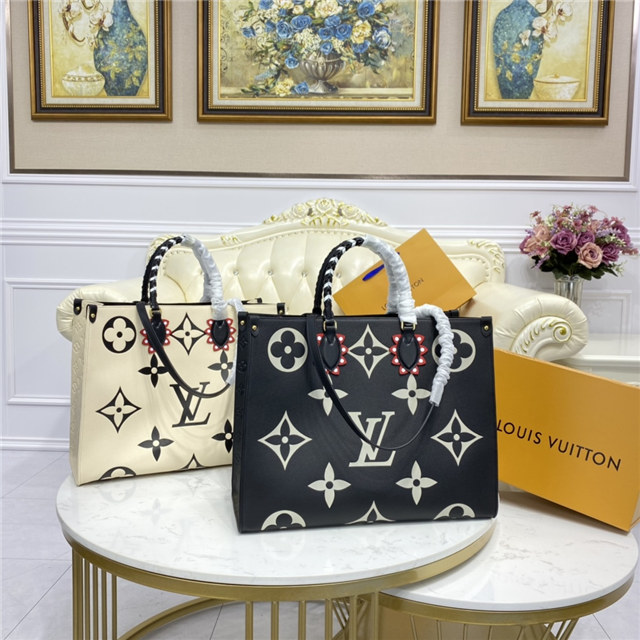 The OnTheGo GM tote bag in embossed leather is adorned with an oversized version of the iconic Monogram pattern. Braided top handles and eye-catching detailing around the handle mounts bring a touch of the street to this bag. The roomy interior, with its numerous inside pockets, make it perfect for everyday wear.