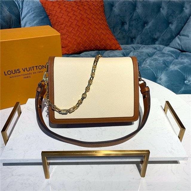 Inspired by a 70s-era archival design, the remastered Dauphine MM handbag is offered for Pre-Fall 2019 in a bicolor edition of blue and beige Taurillon leather, framed in smooth tan calf. The golden LV lock and hexagonal-link chain add polish to the piece, which also features a leather strap for a range of chic carry options.