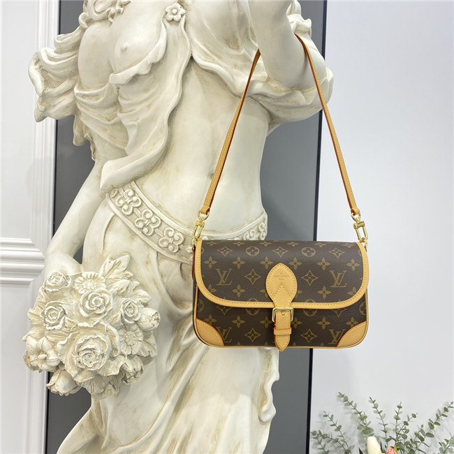 The Diane satchel in Monogram canvas revisits a classic model from the 90s, combining such vintage details as leather corners and an archival-inspired buckle with the modern functionality of smart pockets and a well-organized interior. The exclusive wide jacquard strap reverses from a bold Louis Vuitton signature to a subtle Monogram Flower motif.