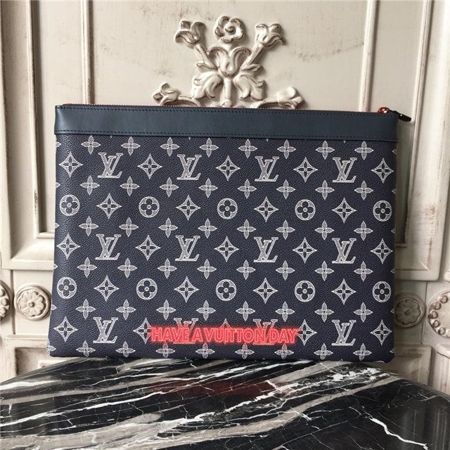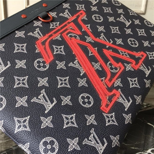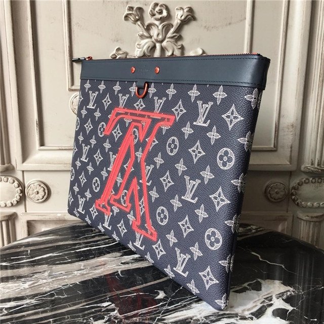 The LV Upside Down Discovery Pochette in Monogram Ink canvas is a stylish way to carry documents and other belongings. Printed in coral pink with the playful LV Upside Down logo, it features coordinating pink and navy hardware. It can be hand-held as a clutch or a document wallet, or slipped inside a larger bag.