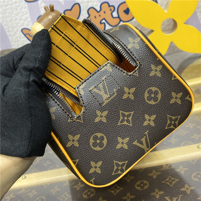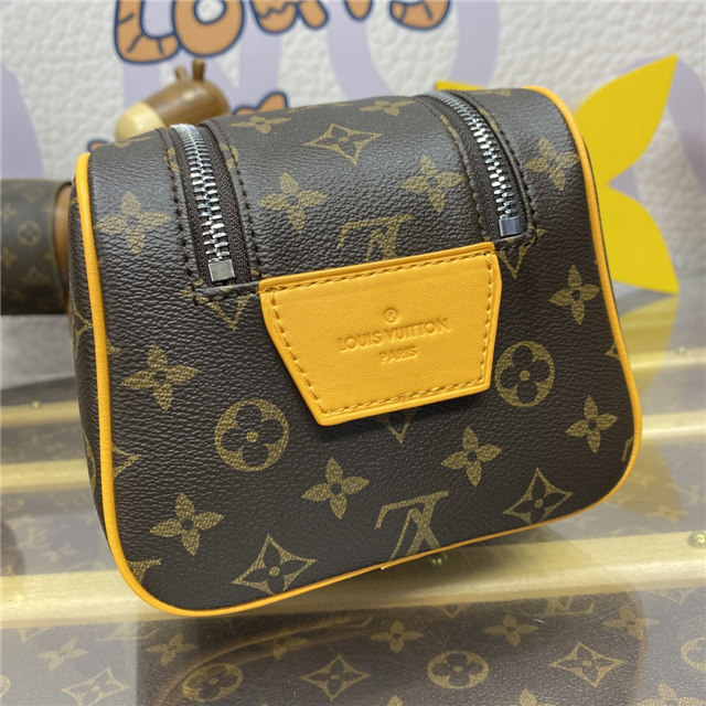Sturdy and practical, the Dopp Kit in Monogram Macassar coated canvas is adorned with colored piping and colored leather on the handle attached to the double zipper. Designed for storing grooming essentials and toiletries, it has a washable lining in the same color as the color of the exterior details.