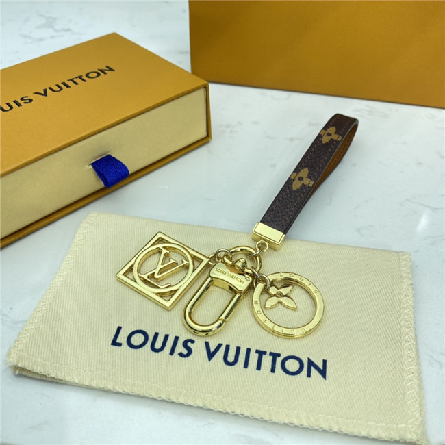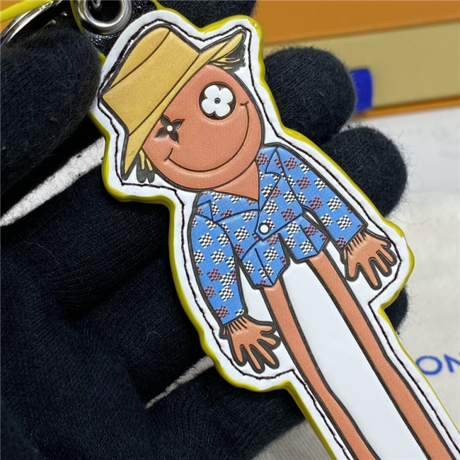 This LV Friends bag charm and key holder depicts one of the playful characters invented by Virgil Abloh to evoke memories of boyhood. Crafted from leather and Monogram canvas with a padded effect, this piece is appealingly tactile. The Louis Vuitton signature is engraved on the ring, and a colorful LV Initials charm hangs from the polished snap hook.