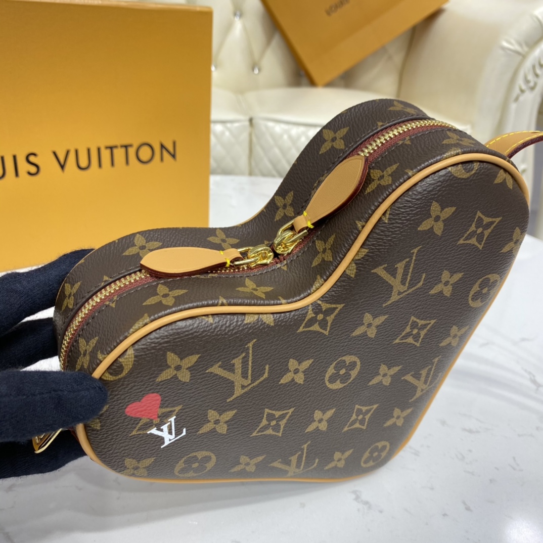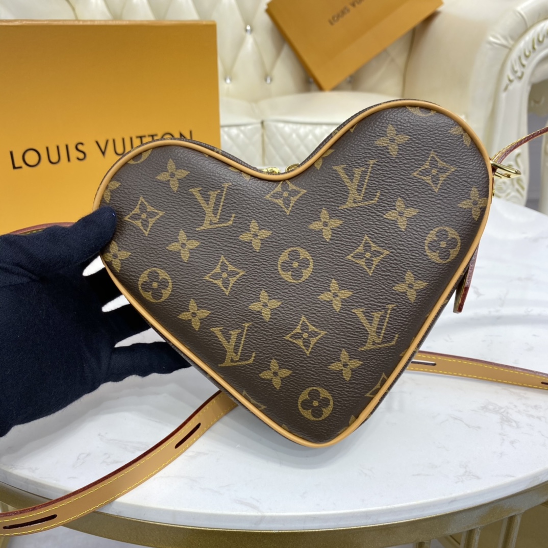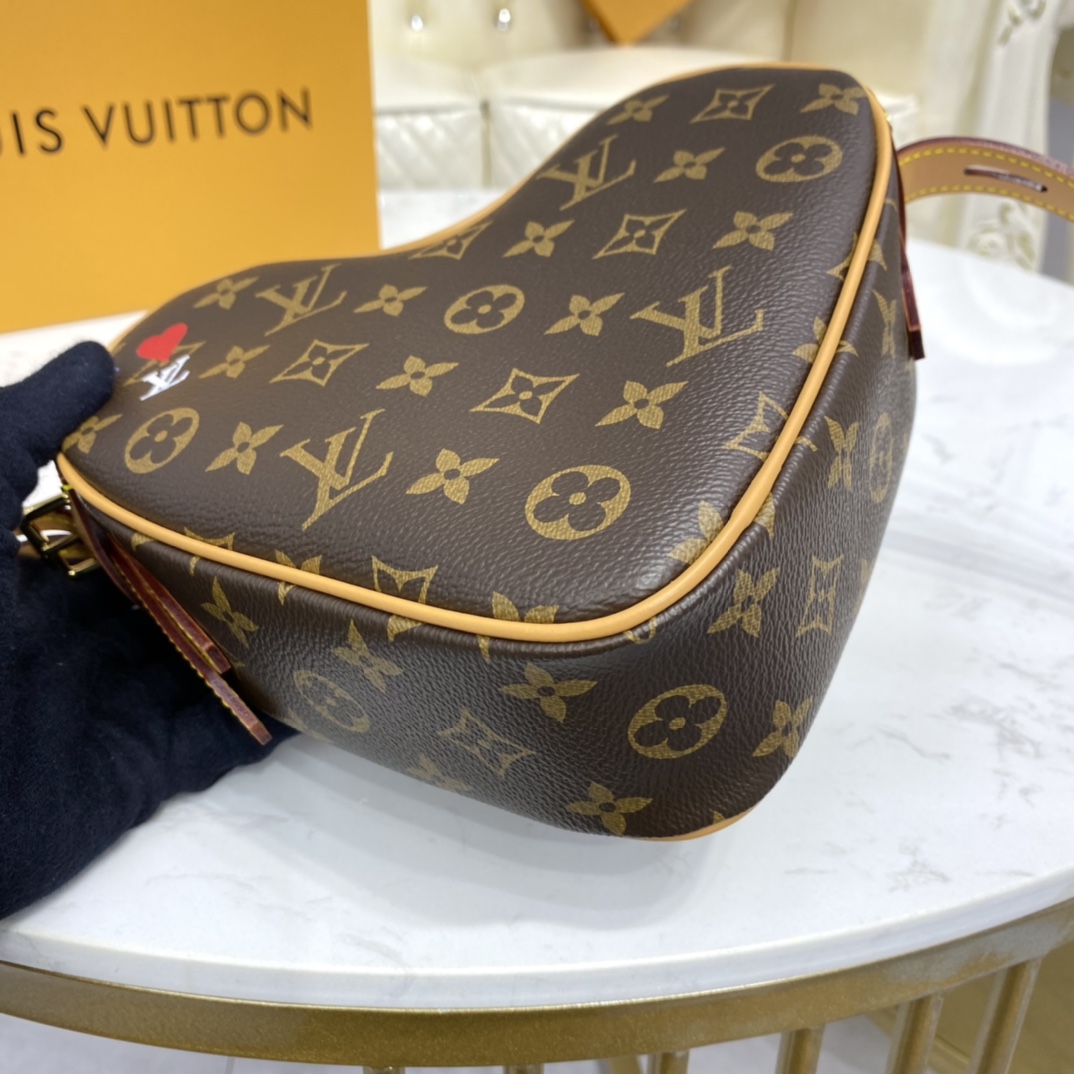 The Coeur is a small handbag in the shape of a heart fashioned from Monogram canvas. For Cruise 2021, Nicolas Ghesquière twists the Monogram pattern by printing a small bright red heart on the top left, echoing the bag’s own form. The adjustable leather strap enables comfortable shoulder and cross-body carry.