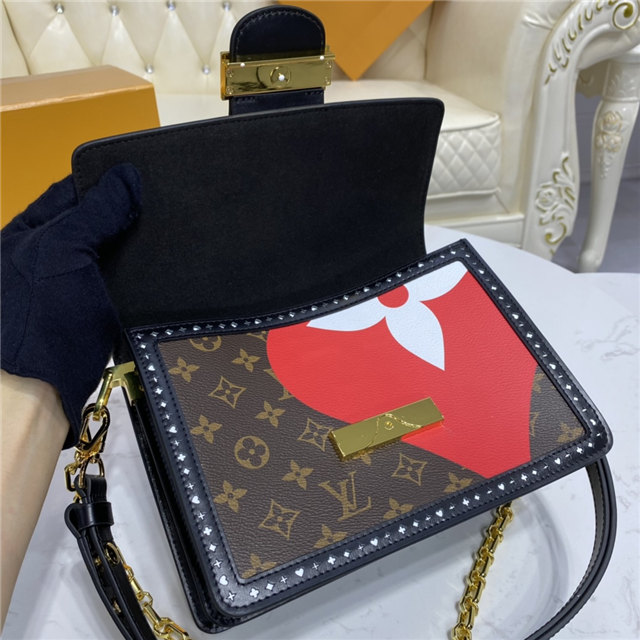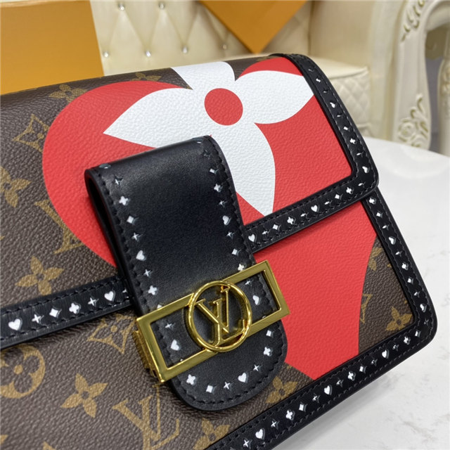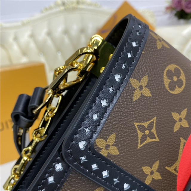For Cruise 2021, Nicolas Ghesquière plays with Monogram canvas, playfully reinterpreting it on the Dauphine MM handbag. The Monogram canvas is dressed up with giant prints of vibrant Monogram Flowers and suits of cards. The technicity of the color printing on the coated canvas emphasizes the subtle design of the patterns.