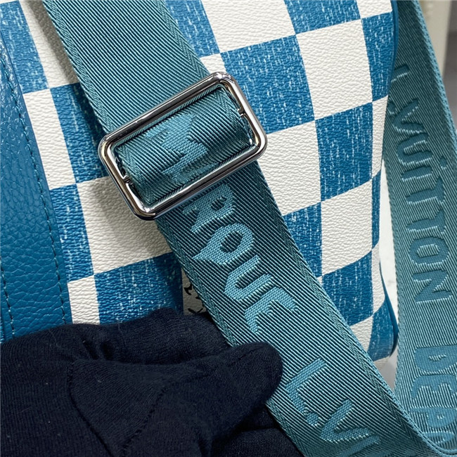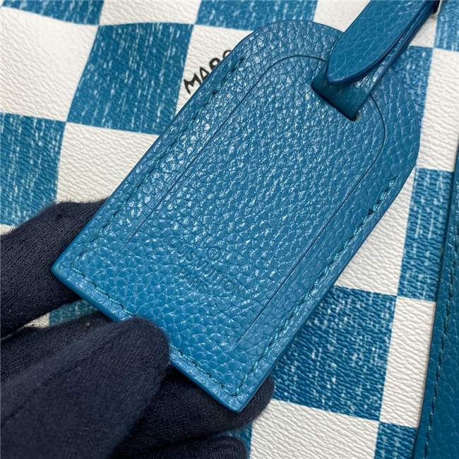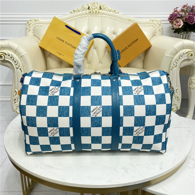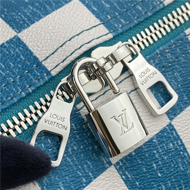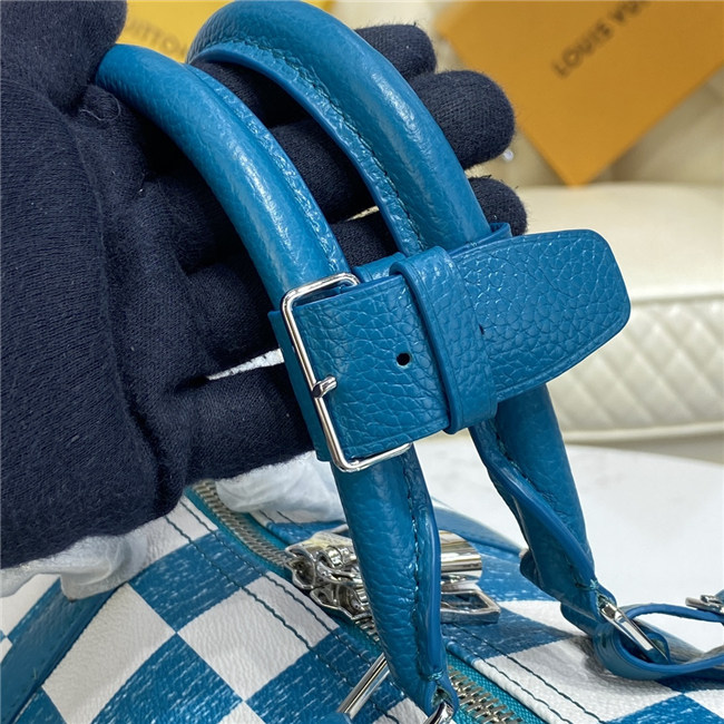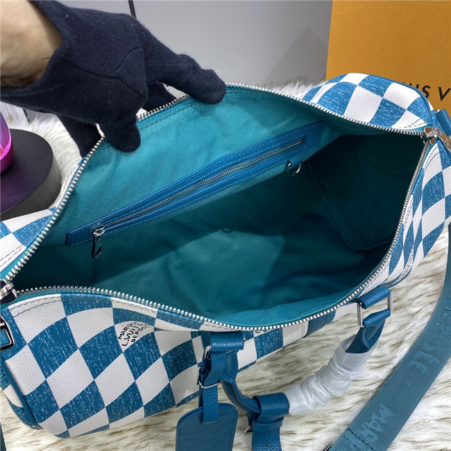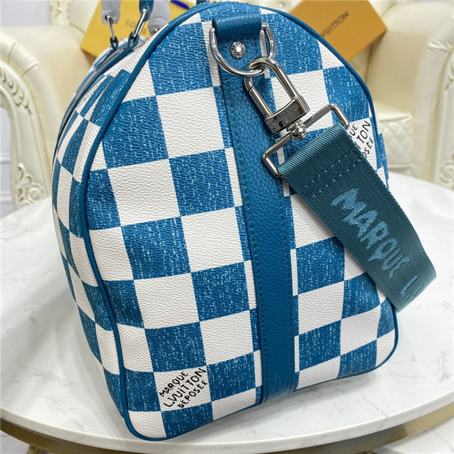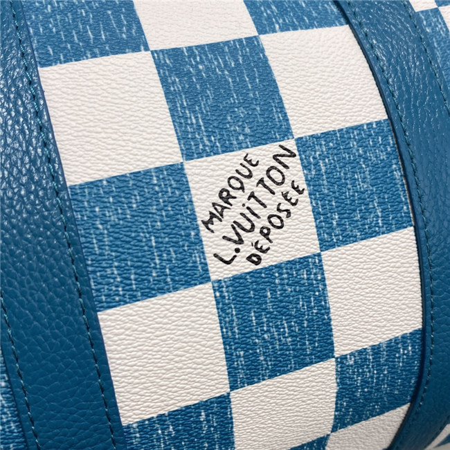 This Keepall Bandoulière 45 bag is fashioned from leather with a Damier checkerboard pattern in teal and white. The leather top handles, side bands, and nametag are also in teal. The squares look as if they were drawn and filled in with a colored pencil. The Vuitton signature in certain squares also has a hand-drawn aspect.