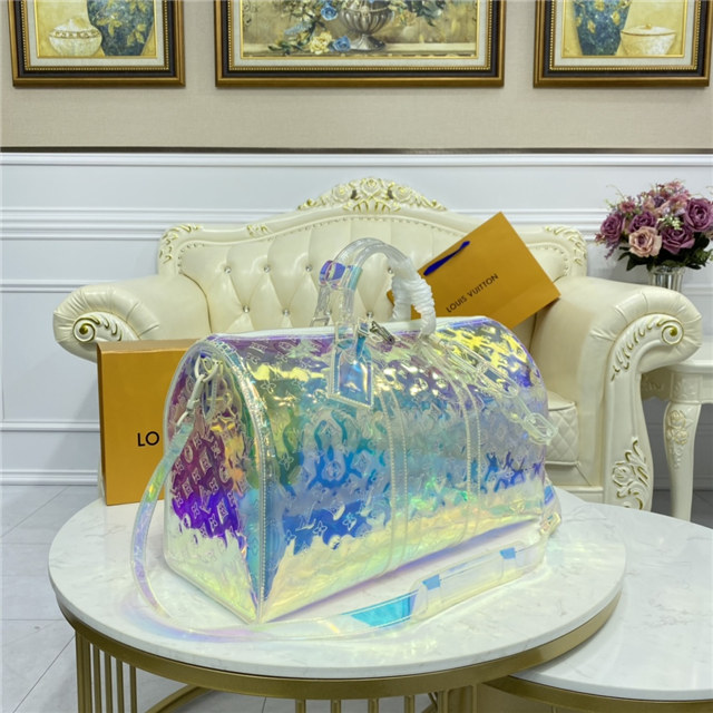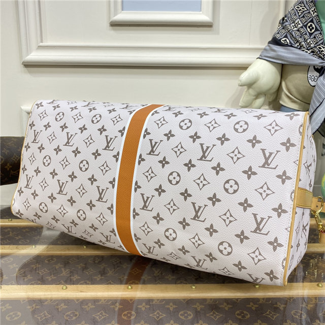 Whether carried by hand or on the shoulder with its removable strap, this Keepall Bandoulière 45 bag in canvas looks stunning. It features saffron on the top handles, name tag, and on the bag’s central stripe. But what makes this bag truly shine is the Parisian-style street sign that says: “Louis Vuitton Paris 1854.”