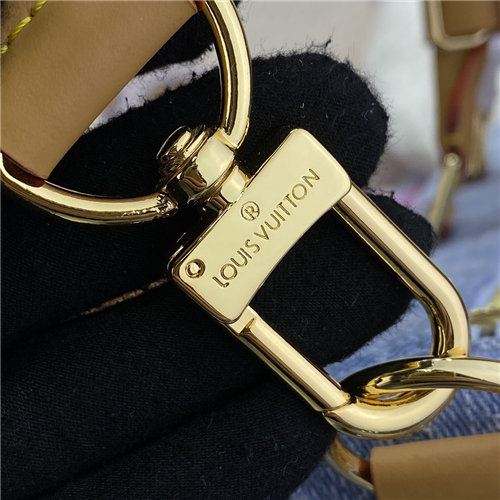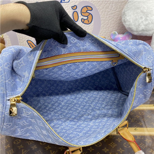 Monogram Denim infuses the Keepall Bandoulière 45 bag with the spirit of summer. A seasonal light blue, the bag is made from 100% organic cotton with a woven Monogram pattern. Stonewashed, each bag is unique. The cowhide-leather trim, on the lateral reinforcement bands and removable shoulder strap, complements the denim.