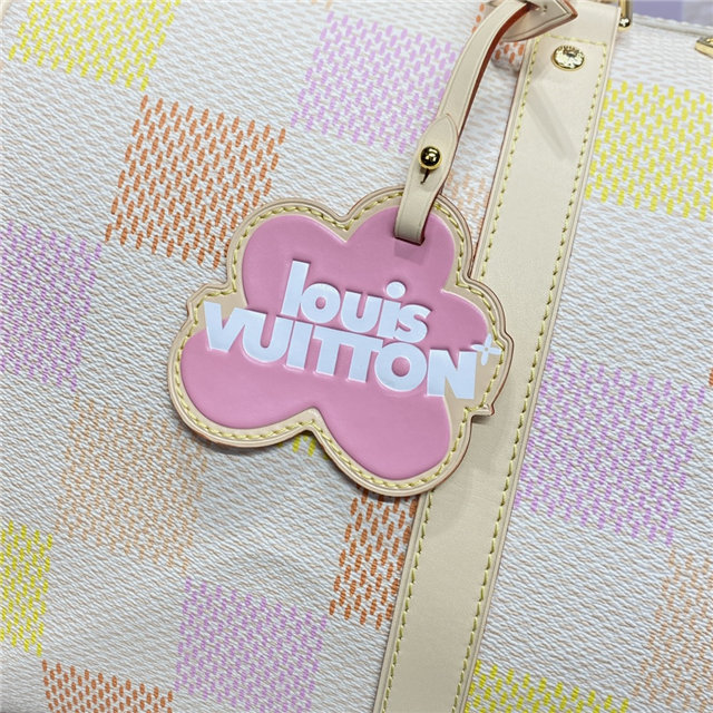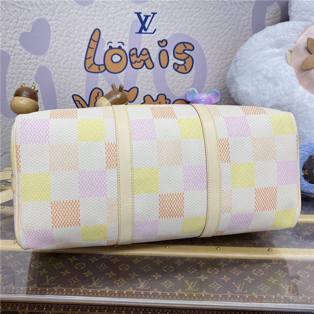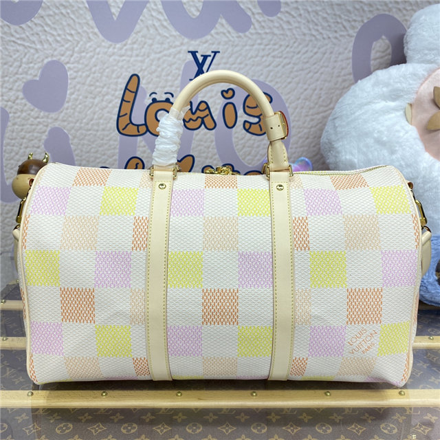 This Keepall 45 Bandoulière bag is made from Damierlicious coated canvas, with its mesmerizing Giant Damier motif combining four different pastel shades. This cabin-sized bag features cowhide-leather top handles, lateral reinforcement bands, and removable name tag. A removable and adjustable leather strap enables shoulder carry.