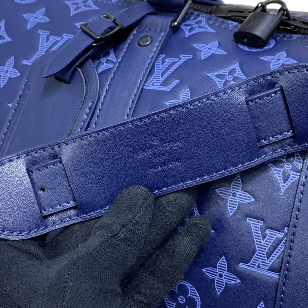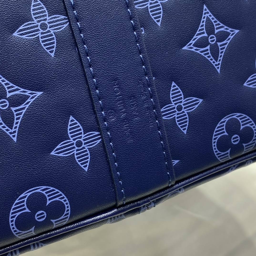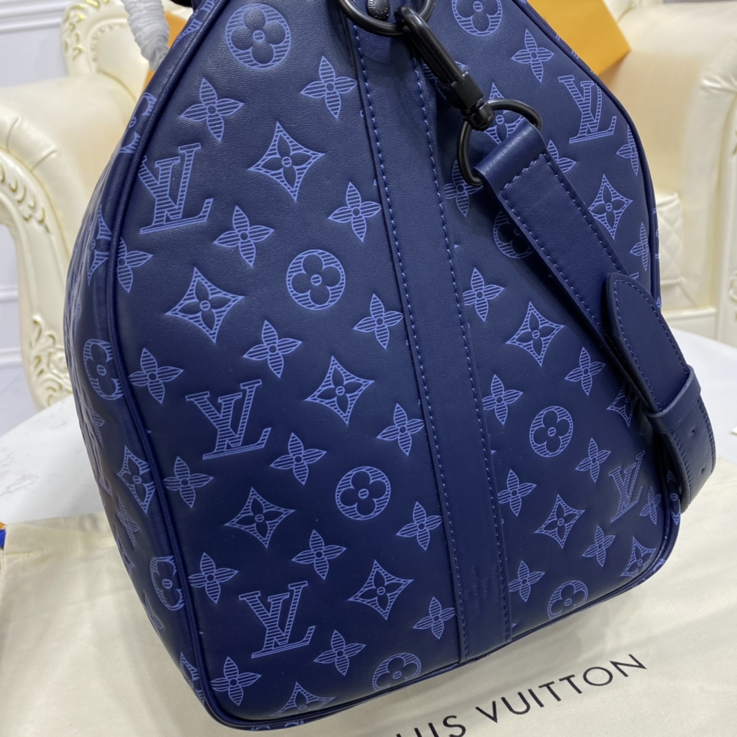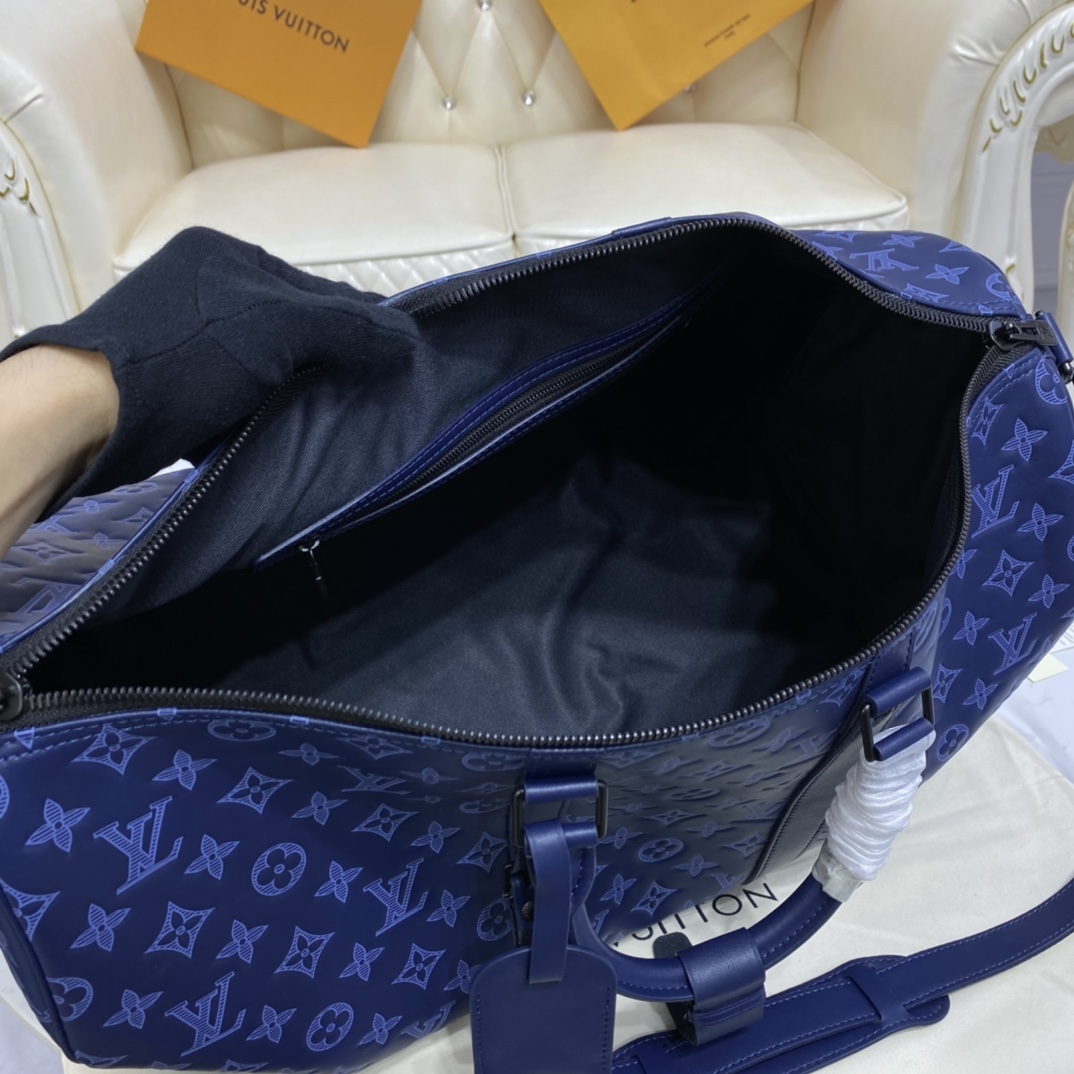 The iconic Keepall Bandoulière 50 weekend bag for men takes on a discreet charm in navy blue Monogram Shadow calfskin leather. The bag’s Monogram motif is printed in light blue and embossed in the leather. Surprisingly roomy for a carry-on, the Keepall 50 features a zipped inside pocket to keep important items safe.