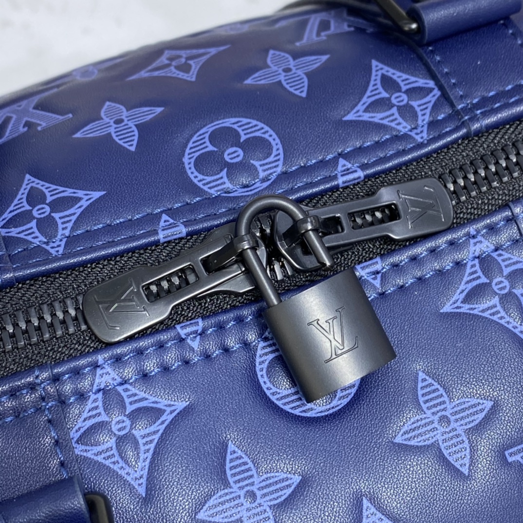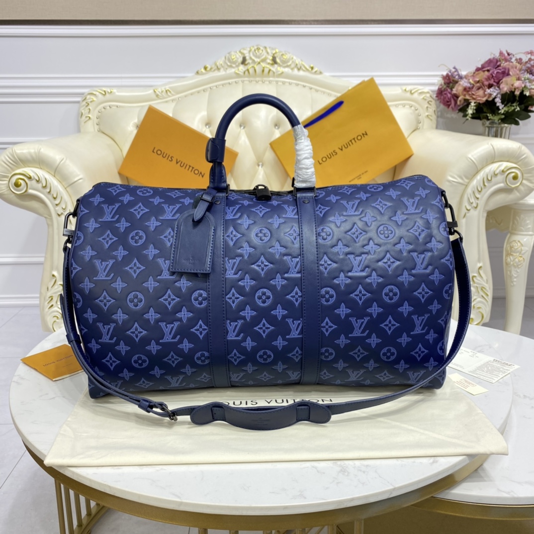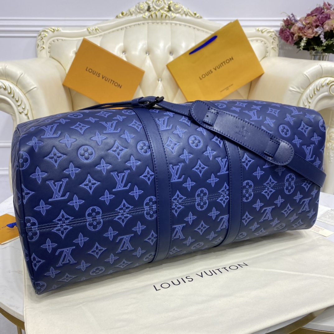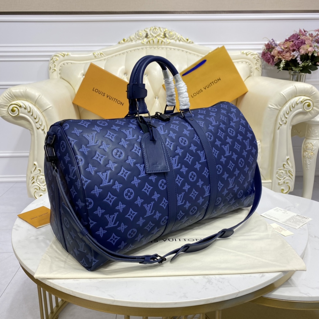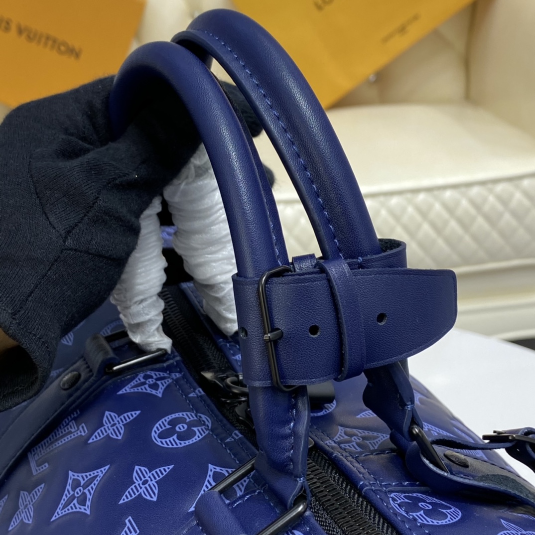 The iconic Keepall Bandoulière 50 weekend bag for men takes on a discreet charm in navy blue Monogram Shadow calfskin leather. The bag’s Monogram motif is printed in light blue and embossed in the leather. Surprisingly roomy for a carry-on, the Keepall 50 features a zipped inside pocket to keep important items safe.