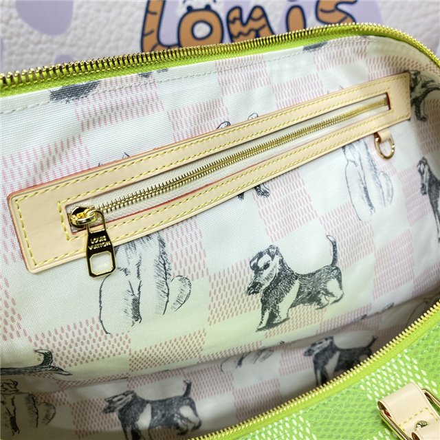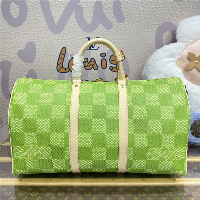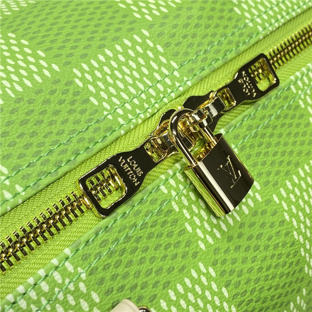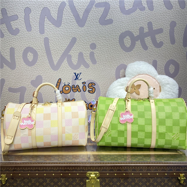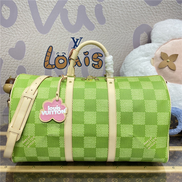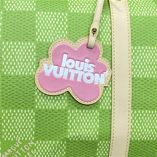 Classic and bold at once, the new Damier Golf coated canvas, with its golf-links inspired colorway, brings panache to the Keepall Bandoulière 50. The bag’s recognizable shape, emphasized by the cowhide-leather side bands and top handles, are signed with a pink Louis Vuitton flower charm. A removable leather strap adjusts for comfortable shoulder carry.